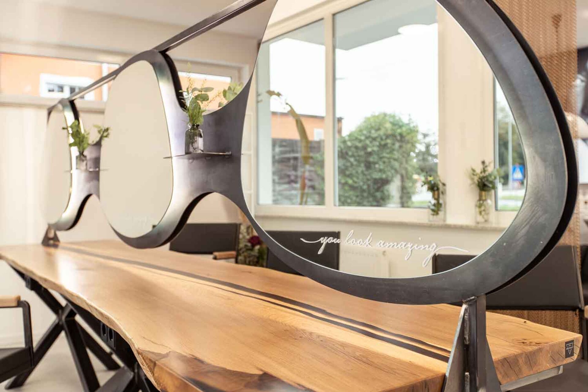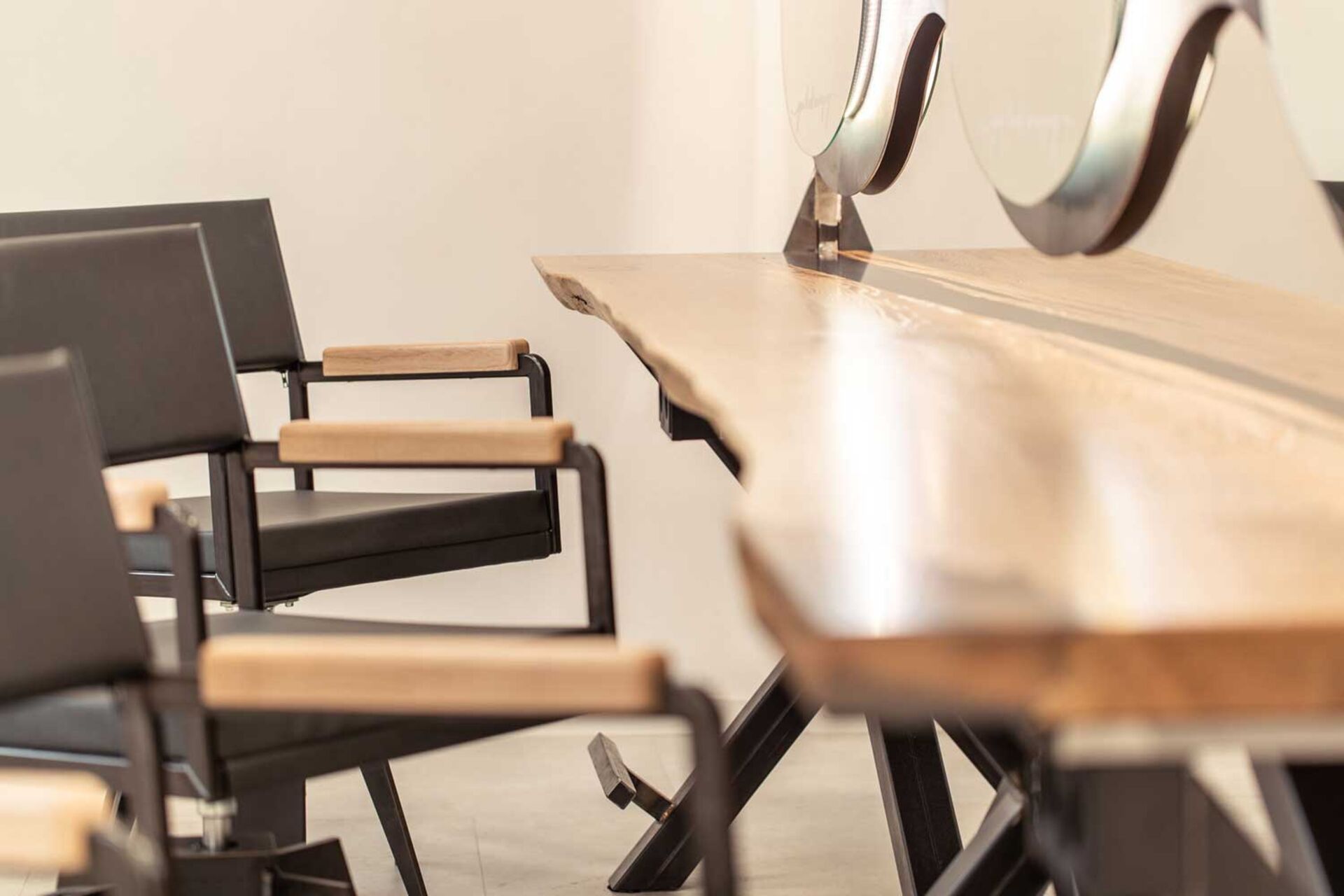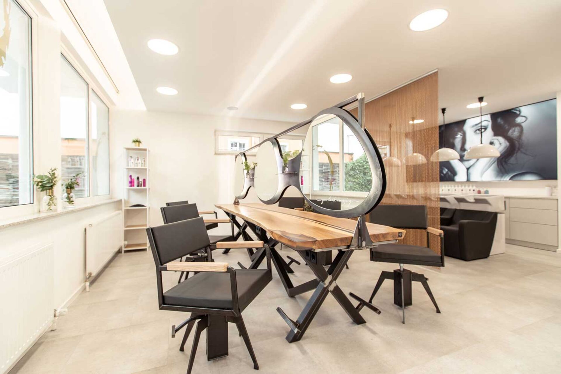 Die Bedienplätze, Rezeption mit Wartebereich und den dreier Frisierplatz wurden gemeinsam mit Dreikant, ein junges Unternehmen aus der Region Salzburg, gestaltet. „Hier war es uns einfach wichtig, etwas anderes zu als die üblichen Friseursalons zu bieten.“, so David Schwarz. Der Baumstamm, der zum Tisch umfunktioniert wurde, war wohl die schwerste Arbeit. „Unsere KundInnen merken schon die Wertigkeit der Materialien!“, freut sich der Salonbesitzer.