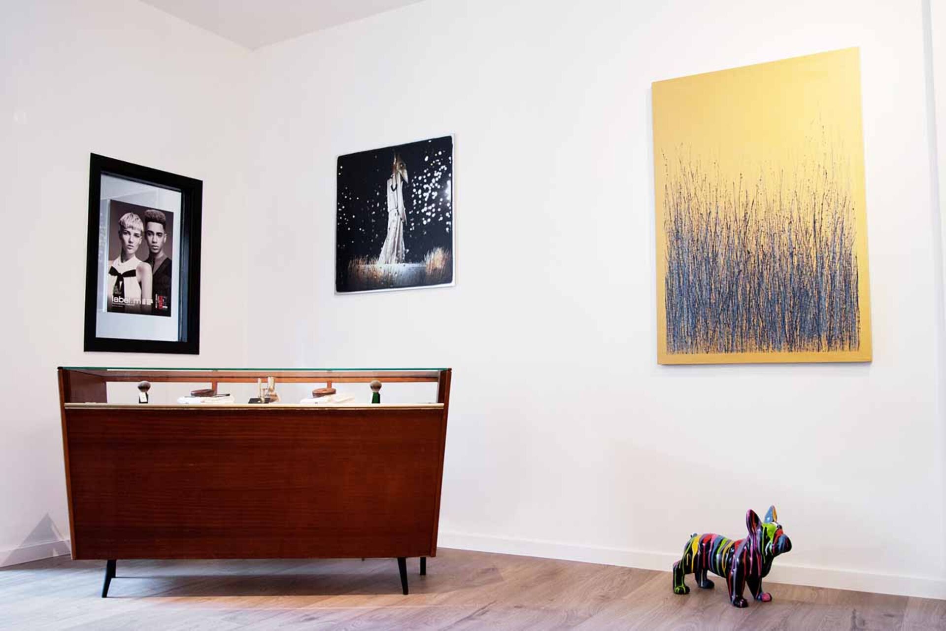 Auf 110 Quadratmetern sorgen Stilmixe für eine ganz besondere Atmosphäre. Giftgrüne trifft auf warme Naturfarben. Die Einrichtung besteht aus überwiegend authentischen Vintage-Stücken und durch die Zusammenarbeit mit der Kunstgalerie "Les Memoires de Jacqmotte" wurde eine fortlaufende Vernissage im Salon eingerichtet. Die Kunstwerke an den Wänden stehen ebenfalls zum Verkauf.