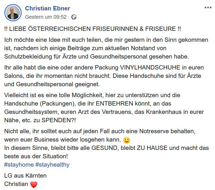 Diesen Charity-Aufruf von Christian Ebner, National Sales Manager KAO Österreich, finden wir toll und haben gleich einmal in einem Wiener Spital nachgefragt. Hier gab man uns die Antwort, dass die Schutzhandschuhe, die normalerweise von Friseuren verwendet werden, leider nicht den Anforderungskriterien derer von Ärtzen entsprechen.