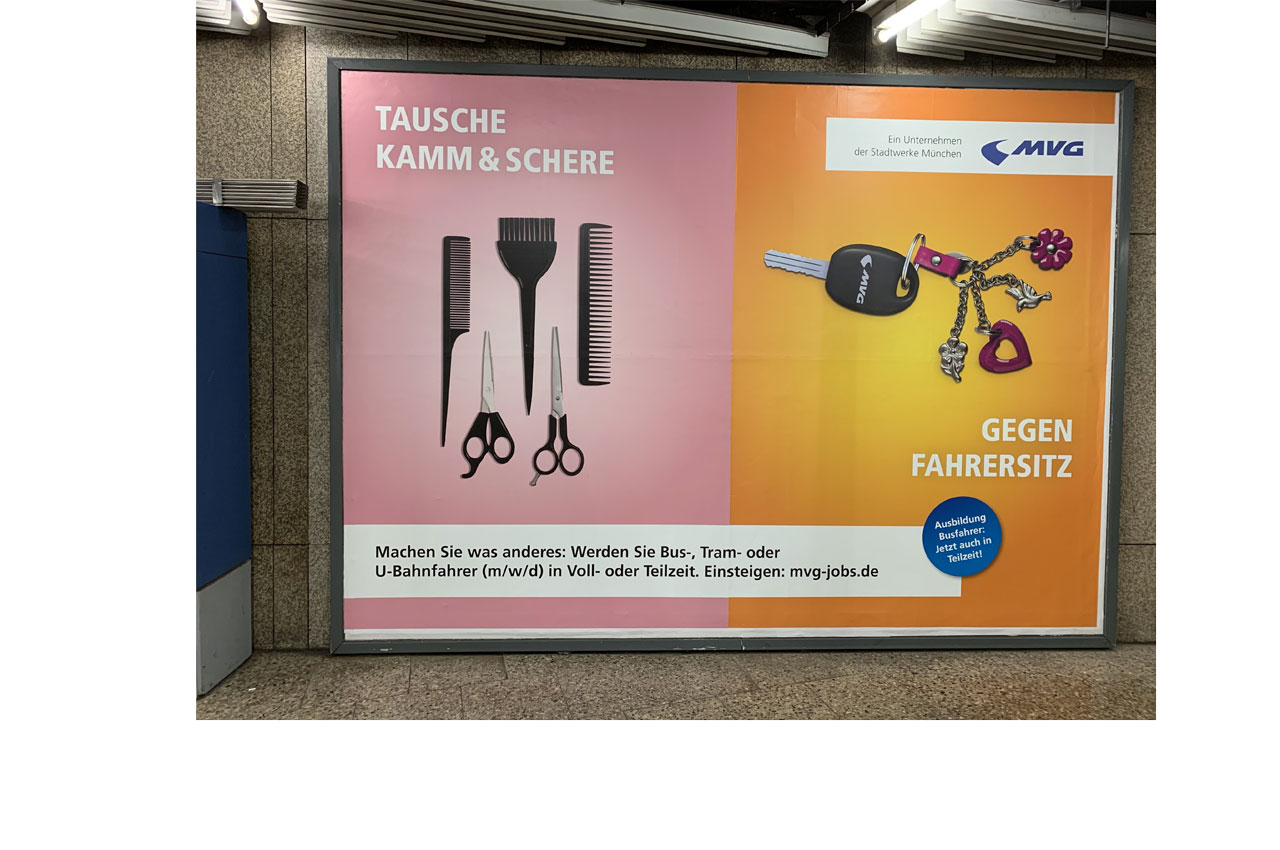 Mit Kopfschütteln reagieren die bayerischen Friseure auf die Werbekampagne „Tausche Kamm & Schere gegen Fahrersitz“ der Münchner Verkehrsgesellschaft MVG. Das Unternehmen der Stadtwerke München plakatiert im U-Bahn-Bereich der Landeshauptstadt einen Aufruf zum Jobtausch für Friseure.