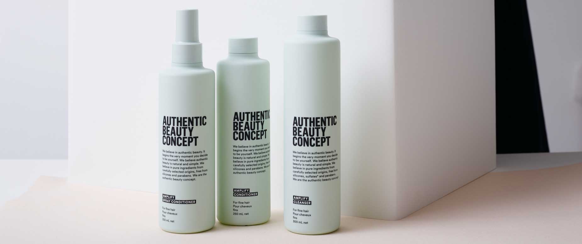 Authentic Beauty Concept will nun dieser Problemstellung ein Ende setzen: Eine neue Serie mit Grüntee soll Volumen verleihen und trotzdem einen schwerelosen, leichten Look garantieren. Die Amplify Produkte „verstärken“ die Haare, wie der Name schon sagt. Die 3-stufige Serie besteht aus Cleanser, Conditioner und Spray Conditioner.