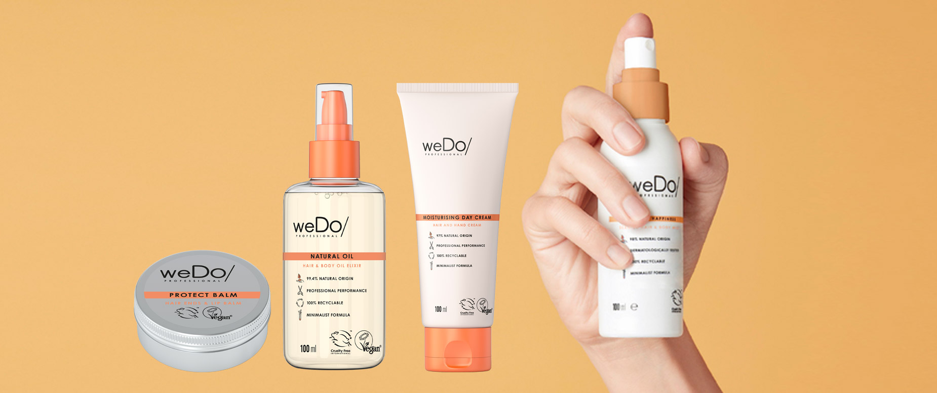 Für die Kund*in, die nicht nur Haar-, sondern auch Hautpflege im Salon erwerben möchte, bietet weDo Professional praktische 2-in-1-Produkte. Ein Balm und drei Produkte zu je 100 ml (Öl, Creme, Spray) passen in jede Handtasche und ermöglichen Sofortpflege für strapaziertes Haar und trockene Haut.
