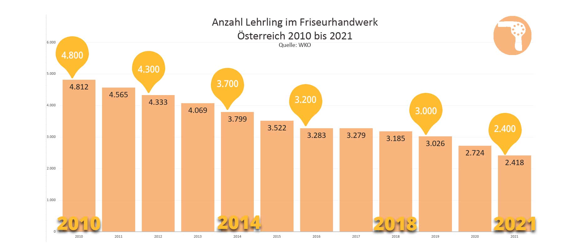 Wäre die Friseurausbildung ein Unternehmen, dann hätten wir eine eindeutige Prognose: In 10 Jahren ist das Unternehmen tot! Die Friseurausbildung verzeichnet seit Jahren diesen Rückgang, Corona hat die Negativentwicklung vielleicht ein bisschen stärker beeinflusst, aber letztendlich setzt sich der Negativtrend der bereits 2010 begonnen hat fort. Wieder gingen von 2020 auf 2021 11% Nachwuchs verloren...