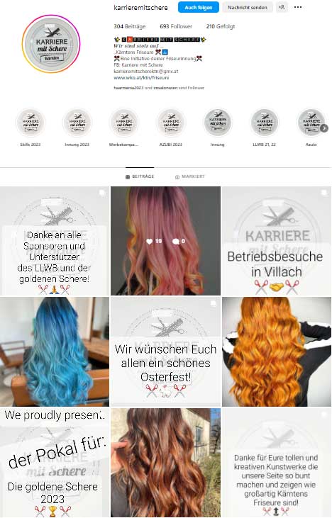 Die Friseurinnung Kärnten betreibt die Instagram Seite @karrieremitschere und die Facebook Seite Karriere mit Schere (Kärnten), um die Mitgliedsbetriebe regelmäßig zu informieren und nach außen hin zu präsentieren.