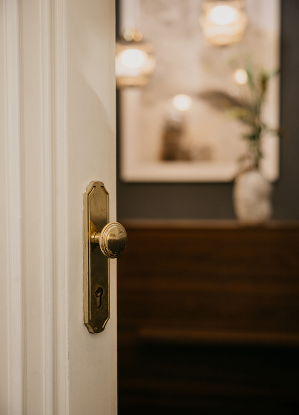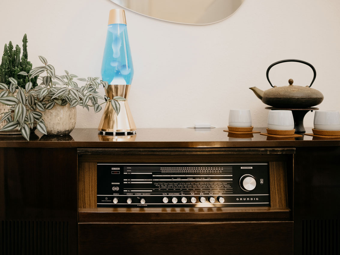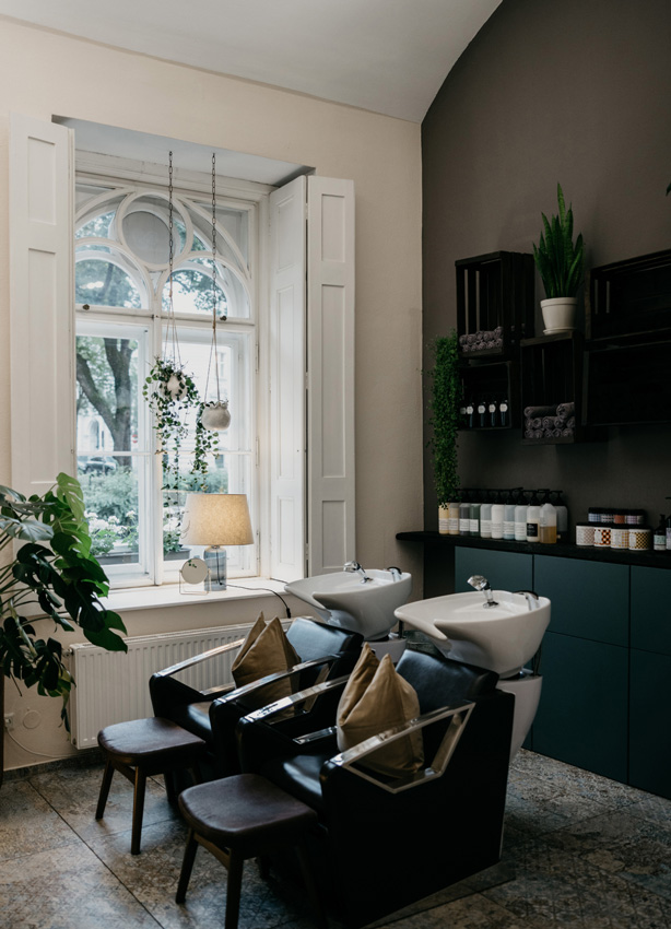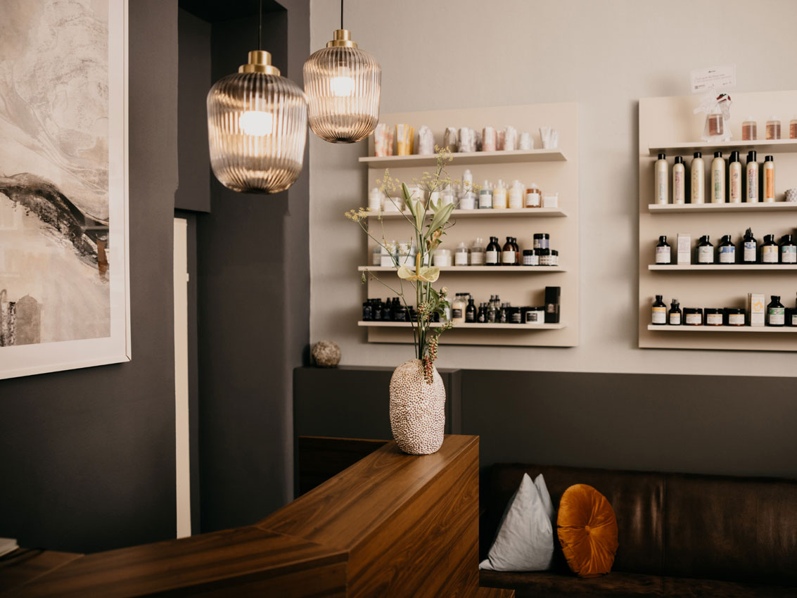Mit Wiener Altbau-Charme besticht Your Choice in der City durch Wärme und perfekt eingesetzte Akzente. Smart platzierte Elemente, wie die Leinen-Vorhänge mit Blumen-Optik, schirmen vom Trubel der Außenwelt ab. Die historischen Elemente der Altbaufenster bleiben aber sichtbar und sorgen für warmes Sonnenlicht. Blumen-Elemente in Petrol, die sparsam, dafür bewusst platziert wurden, vermitteln ein New-Retro Feeling. Ganz Japandi wirken die präsentierten Produkte fürs Auge angenehm kuratiert. Vasen in organischer Form werden als Signature Piece an der Rezeption eingesetzt und auch die Spiegel am Arbeitsplatz sind groß und rahmenlos. Sie sorgen gerade deshalb für absolute Ruhe. Als Deko werden ein Retro-Radio, japanisches Tee-Geschirr und eine Lavalampe mit viel Grünen Pflanzen, stehend sowie hängend, eingesetzt.
