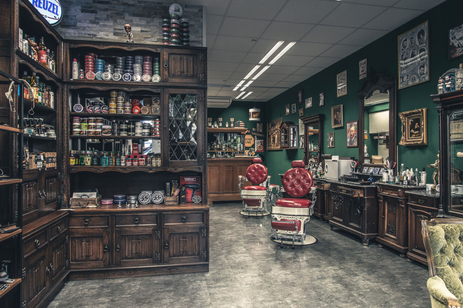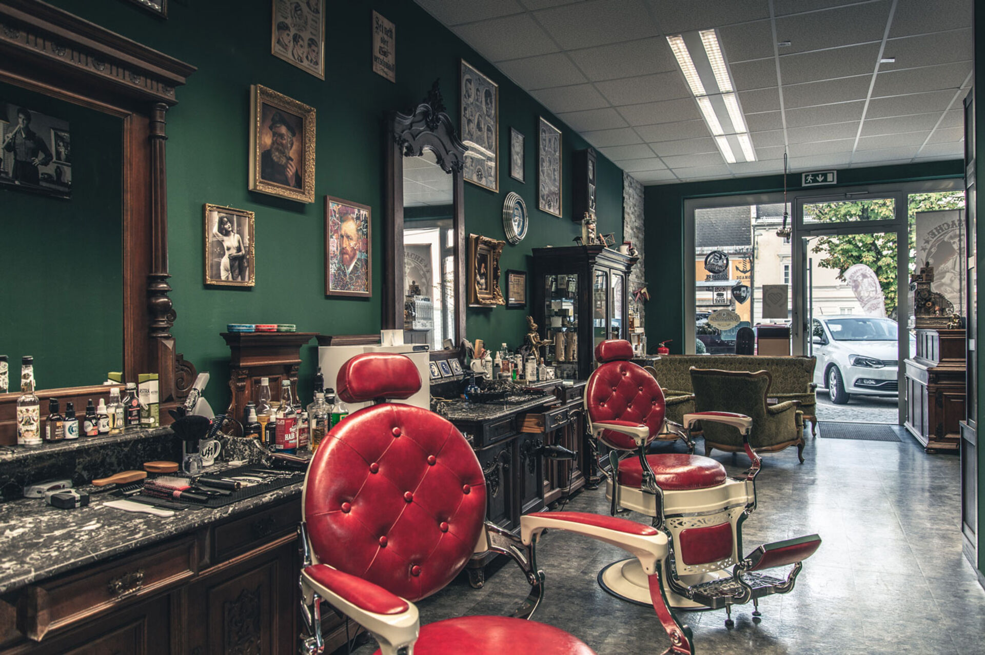 - 60 m² Oldschool-Charme – eingerichtet im antiken Barber-Style, zwei voll ausgestattete Plätze + Waschbecken, erweiterbar auf mindestens 4 Bedienplätze & 2 Waschplätze.