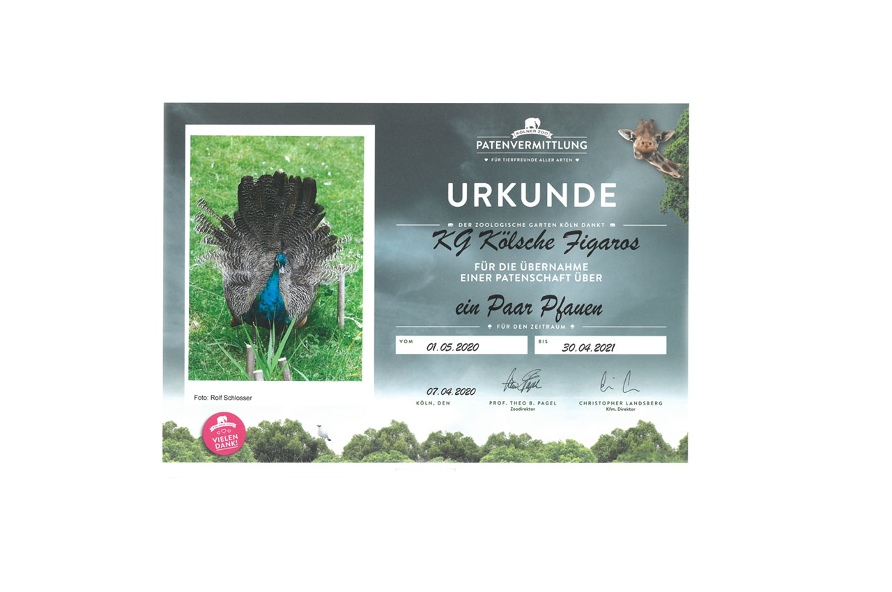 Nicht nur den Menschen sollte man in Zeiten von Corona etwas Gutes tun, auch die Tiere sollten nicht zu kurz kommen. Die Schließung aller Zoos bedeutete auch keine Besucher und somit blieben die Kassen für das Tierfutter leer. Der Vorstand der K. G. Kölsche Figaros e.V. von 1950 hat deswegen eine Tierpatenschaft im Kölner Zoo übernommen und sich für ein Pfauenpaar entschieden.