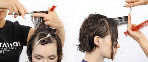 Step 2| Beginnen Sie mit dem Haarschnitt am Hinterkopf. Bestimmen Sie die Länge horizontal auf beiden Seiten des Hinterkopfs. Ziehen Sie die Gesamtmenge des Haars nach oben.