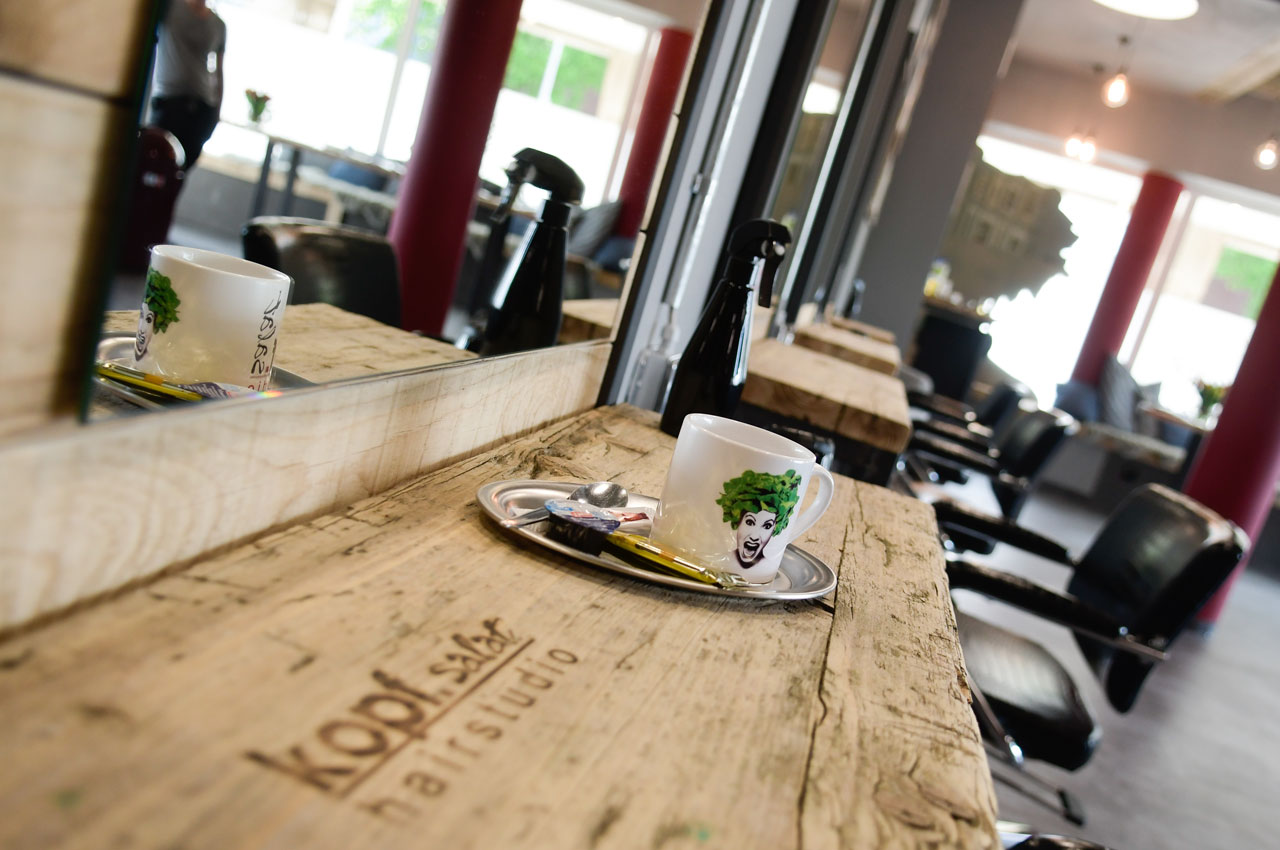 "Es läuft!" für Taifun Yalcin, denn mittlerweile eröffnete der Salonbesitzer seinen 5. "Kopfsalat"-Salon im Münster Zentrum. Bei dieser Filiale wollte er einen Fabrik-Look mit gemütlicher Atmosphäre schaffen. Heißt: Rustikale Holz-Einrichtungselemente und Schalbretter, sowie eine offene Decke mit sichtbaren Balken wurden mit modernen Sitzmöbeln aus Leder und warmen, gediegenen Farben kombiniert. Die Spiegelrahmen und Tische an den 6 Bedienplätzen passen sich dem Stil an. Die Deckenleuchten unterstreichen den urbanen Manufaktur-Look.