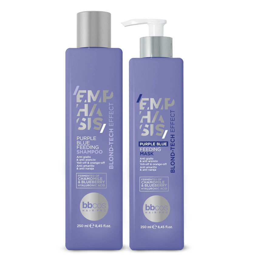 Das Purple Blu Feeding Shampoo und die Maske von bbcos reinigen das Haar sanft und nähren es, indem sie die geschwächte Haarfaser mit Nährstoffen und Feuchtigkeit versorgen. Die violett-blaue Formulierung für blondes oder gebleichtes Haar neutralisiert unerwünschte gelb-orangefarbene Strähnchen, erhält kühle Blondtöne und hellt selbst die Farbe von grauem Haar auf. Die Produkte enthalten zudem eine Kombination der Wirkstoffe Hyaluronsäure, Heidelbeere und Kamille, um die Hydratation und Nährstoffversorgung der sensiblen Haarfaser auszugleichen und gesundes und glänzendes Haar zu erhalten.