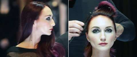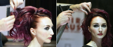 Toupierte Strähnen gleichmäßig über Haarteil verteilen, darunter und drauf in gezielten Positionen locker befestigen und mit Haarspray fixieren, bis Haarteil nicht mehr durchblitzt.
