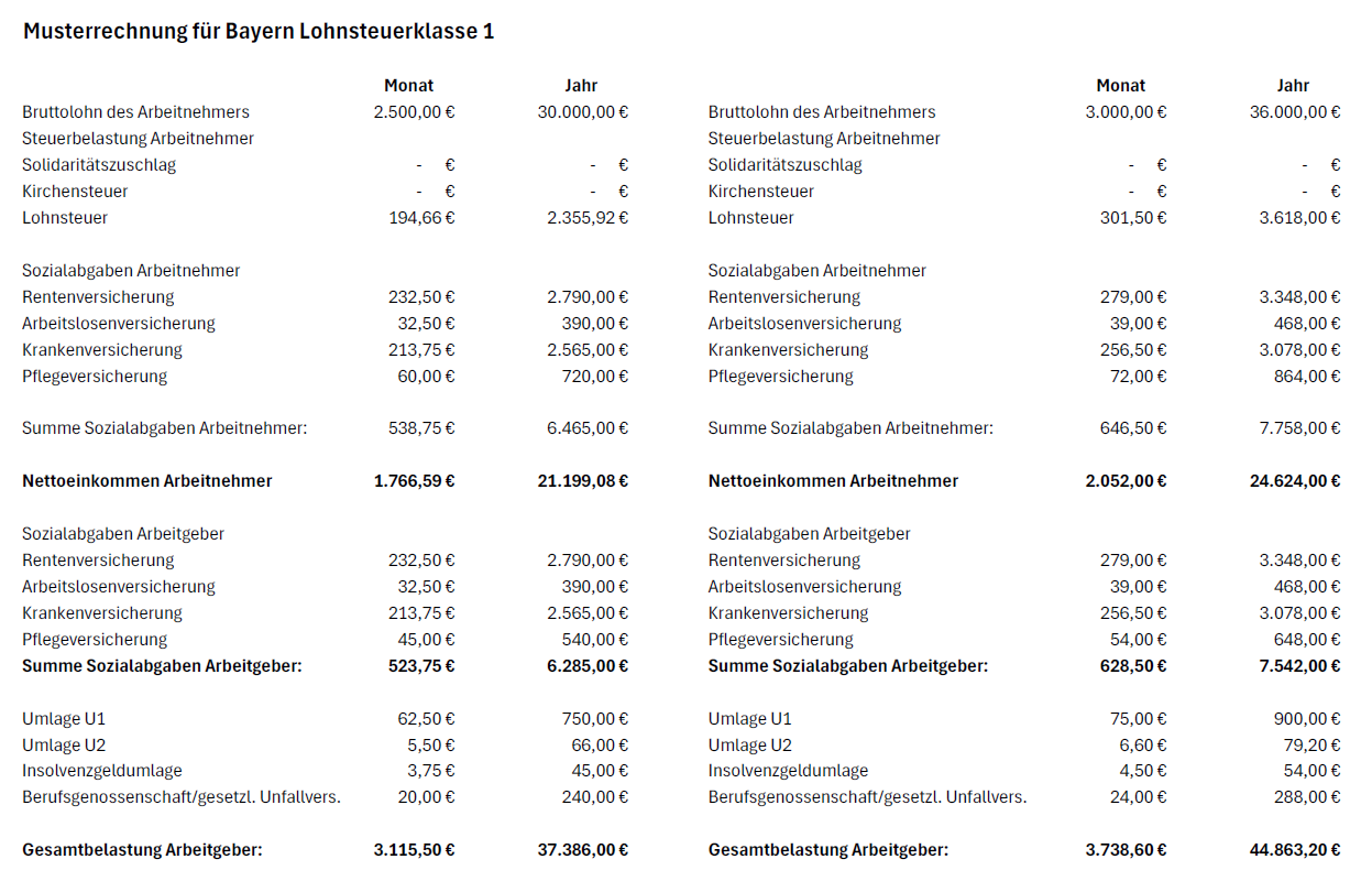 Und: Beim Mitarbeitenden kommt nicht automatisch „mehr“ im selben Verhältnis an. Steigt der Bruttolohn von 2.500 € auf 3.000 € (also um 20 %), kommt das nicht vollständig beim Mitarbeitenden an: Der Nettolohn steigt lediglich um 16 % auf 2.052 €.