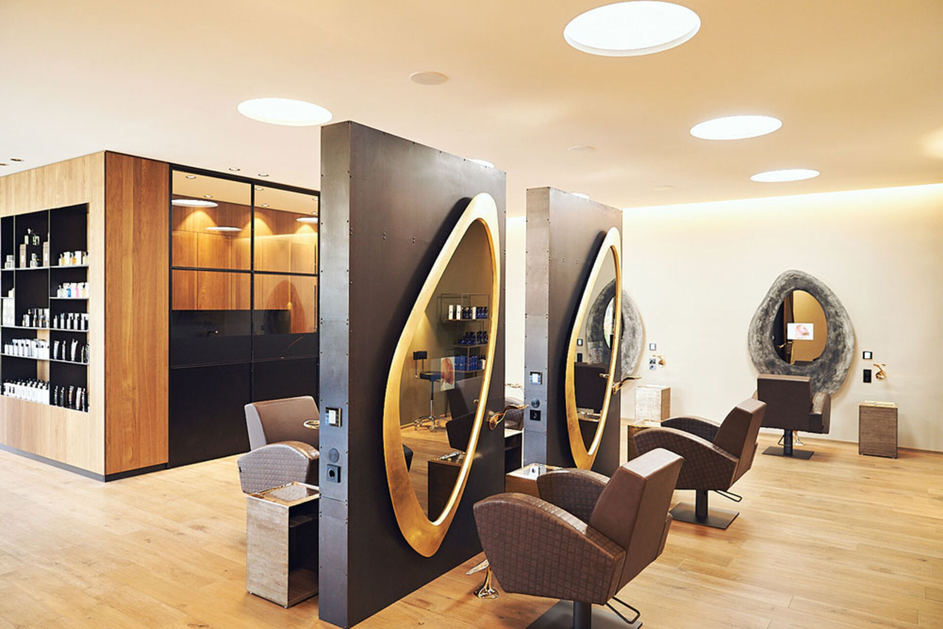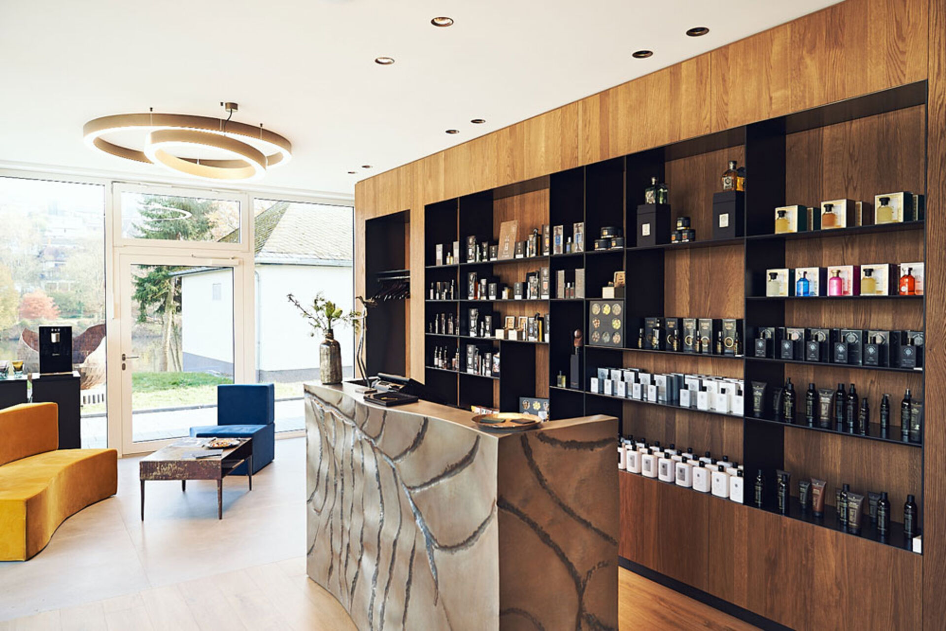 Ein paar der Wände sind mit Holz verkleidet, andere wiederum sind hell und einfach gestaltet. Der Tresen in Steinoptik im Eingangsbereich bildet den Kontrast zu den hölzernen Einrichtungselementen. Farbe bekommt der Salon durch die Couchgarnitur ebenfalls im Eingangsbereich, die in einem gelblichen Gold und einem Azurblau vorzufinden ist. Produkte verzieren die Regale, aber auch Inspirationen, die an eine sensorische Reise erinnern: von geschmackvollen Ölen über edle Parfums bis hin zu italienischen Uhren bietet der Salon alles an.