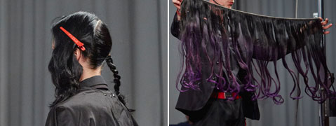 Step 2| Die Extensions werden von unten beginnend um den geflochtenen Zopf gelegt und am Zopfende fixiert.