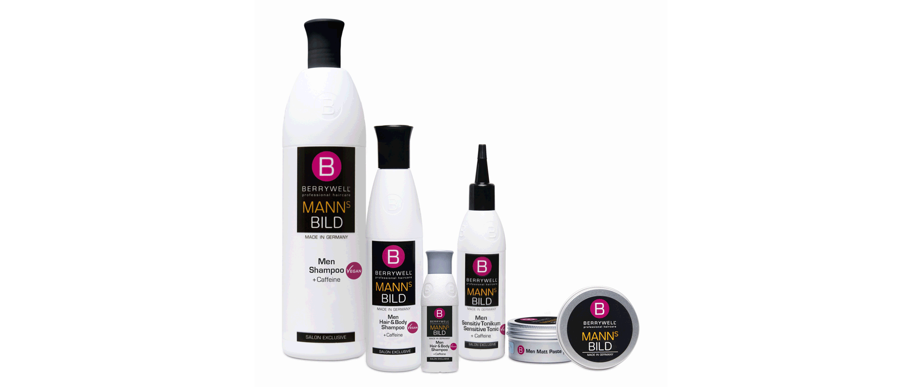 Kaffee zum Frühstück? Koffein in der Dusche! Das Berrywell MANNsBILD Shampoo (erhältlich in drei Größen) verleiht dem Haar im Nu mehr Power. Bei juckender Kopfhaut leistet das Men Sensitiv Tonikum Soforthilfe, eine Matt Paste sorgt für ein kräftiges Finish.