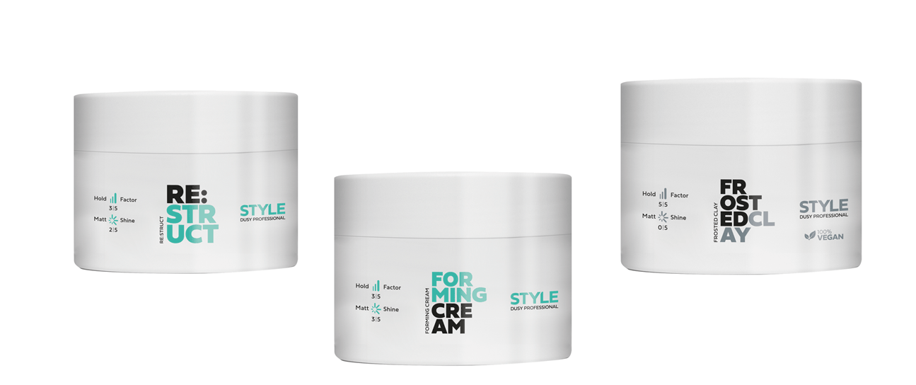Von voluminös bis stark definiert: die neuen Dusy Style Pasten eignen sich für das Stylen sämtlicher Looks. Eine Forming Cream für flexiblen Halt, eine RE:STRUCT Creme für sanften Glanz und eine Frosted Clay Creme für texturierte Looks bilden das perfekte Styling-Trio.