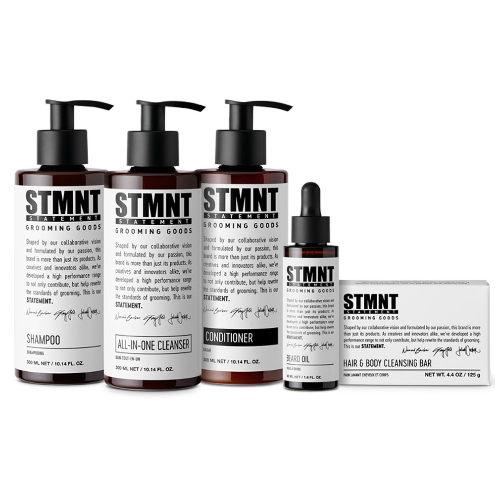 Internationale Barber-Stars haben sich zusammengetan, um die neue Marke STMNT zu kreiren, die von Pflege- bis Stylingprodukten alles für den perfekten Look beinhaltet. Für die tägliche Reinigungsroutine gibt es einen All-in-One Cleanser, ein Shampoo und einen Conditioner sowie ein Bartöl und eine Hair & Body Cleansing Bar.