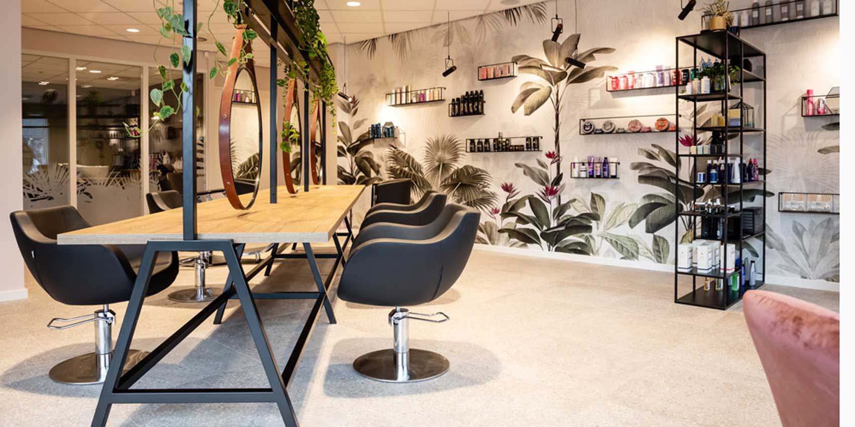 Dieses Design spricht für sich: saftig-grüne Pflanzen, die von dem schwarzen Spiegel-Stahlgerüst herunterwachsen und Tapeten, die mit aufgemalten Urwaldpflanzen bestückt sind – das nennt man Dschungelfieber im niederländischen Salon Tease. Die Mischung aus braunen Eichenholzelementen und schwarz lackiertem Stahl bringen die gewollten rustikalen Vibes in den Raum. Ein paar dunkle Ledersessel, die vielen Pflanzen und eine braune Mosaikwand im Haarwaschbereich, sorgen für ein ebenfalls rustikales, aber naturverbundenes Design. Exotisch wird es mit der Tapete – Palmen und Blumen sind zu sehen, die das Urwaldfeeling umso mehr in den Salon bringen. Urlaub im Dschungel während eines Friseurbesuchs, na das klingt doch nach Entspannung!