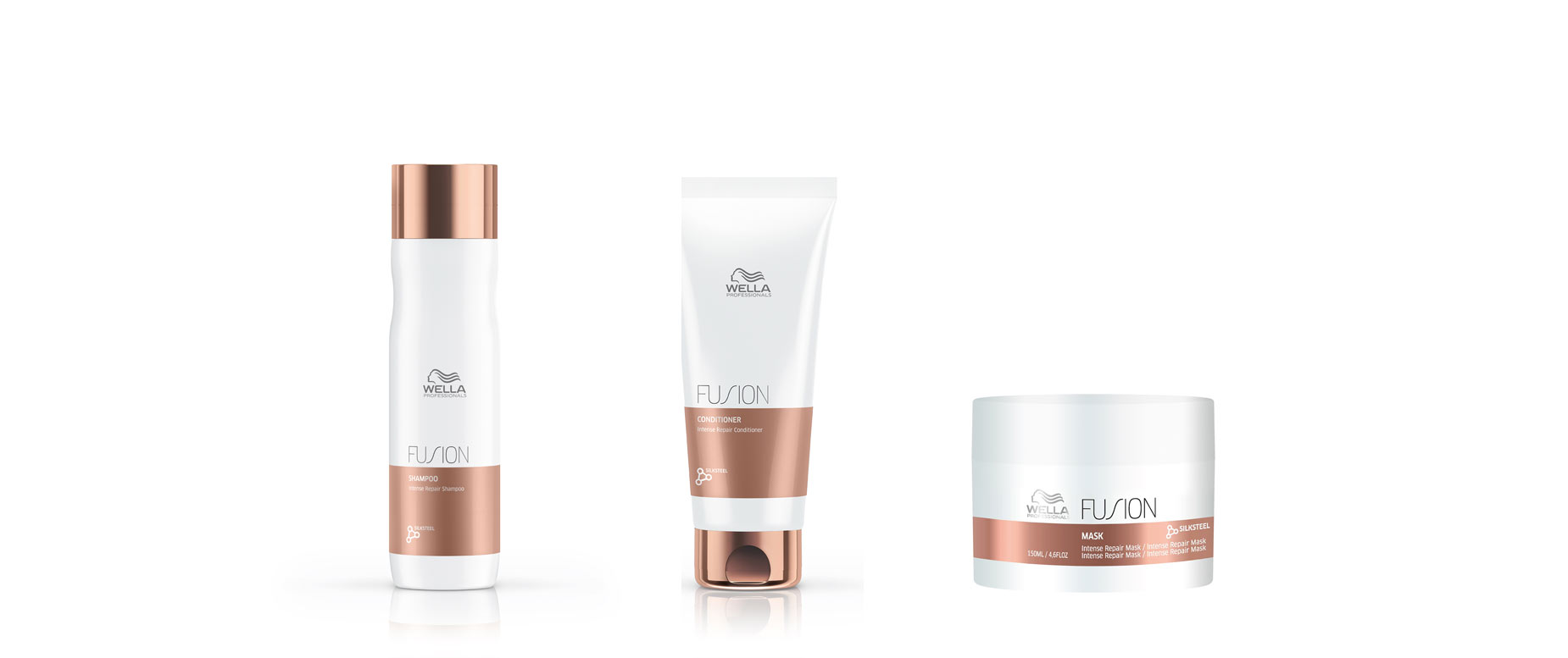 Fusion? Das bedeutet gezielte Pflege mit dem SILKSTEEL Programm, einer Kombi aus Seiden-Aminosäuren und Micro-Lipiden. Sie macht das Haar von innen heraus um bis zu 95% widerstandsfähiger gegen Haarbruch und pflegt die äußere Haarschicht. Selbst sehr angegriffenes Haar fühlt sich wieder gesund und geschmeidig an. Teil der Serie sind ein Shampoo, ein Conditioner, eine Maske und ein Salon-exklusiver Amino-Refiller: