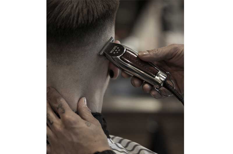 Step 3 & 4 | Mit den Aufsteckkämmen 4,5 mm bis 1,5 mm einen hautnahen Übergang im gesamten Nacken- und Seitenbereich ausarbeiten. Anschließend die Konturansätze der Nacken- und Seitenbereiche nach oben hin verlaufend ausrasieren.