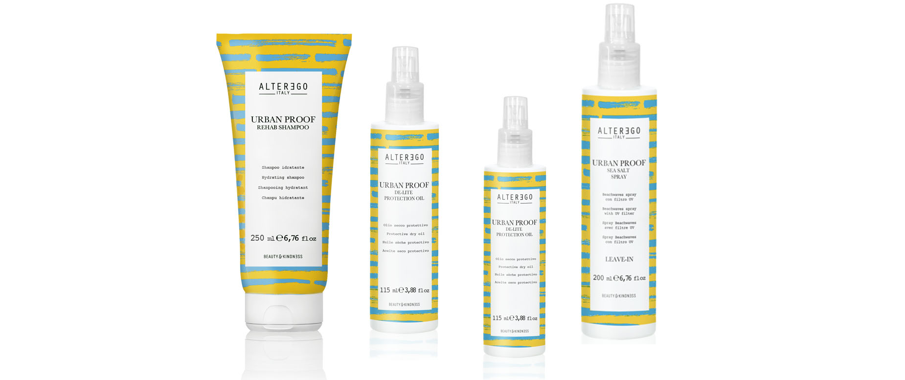 Die Pflegeserie enthält insgesamt vier Produkte: Shampoo, Conditioner, Leave-In-Öl und ein Salzspray. Das für alle Haartypen geeignete Rehab Shampoo spendet intensiv Feuchtigkeit und reinigt rückstandsfrei, damit sich das Haar nach längeren Aufenthalten in der Sonne regenerieren kann. Der Leave-In Conditioner mit No-Rinse-Schutz, Urban Shield-Technologie und UV-Filter schützt nicht nur die Haarspitzen sondern auch die – natürliche und kosmetische – Haarfarbe vor der bleichenden Wirkung der Sonneneinstrahlung. Für jedes Wetter geeignet ist das De-Lite-Protection-Oil, das das Haar seidig weich macht und eine starke Anti-Frizz-Wirkung hat. Das Sea Salt Spray gibt dem Haar Fülle und Griffigkeit - für den perfekten Beach Look.