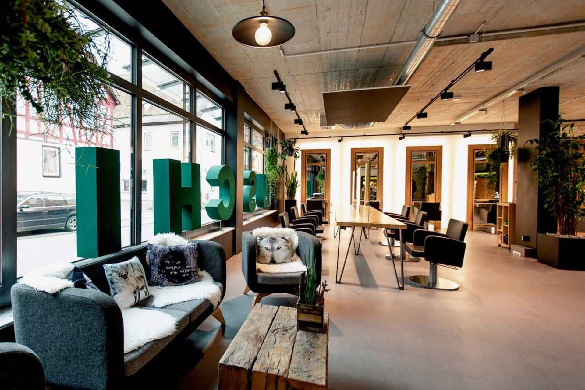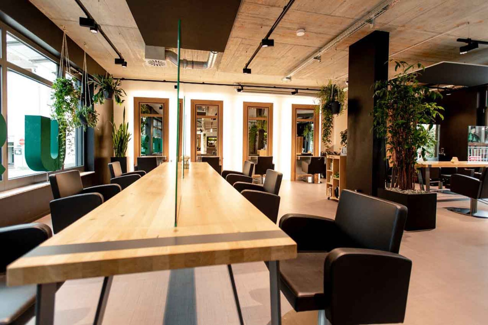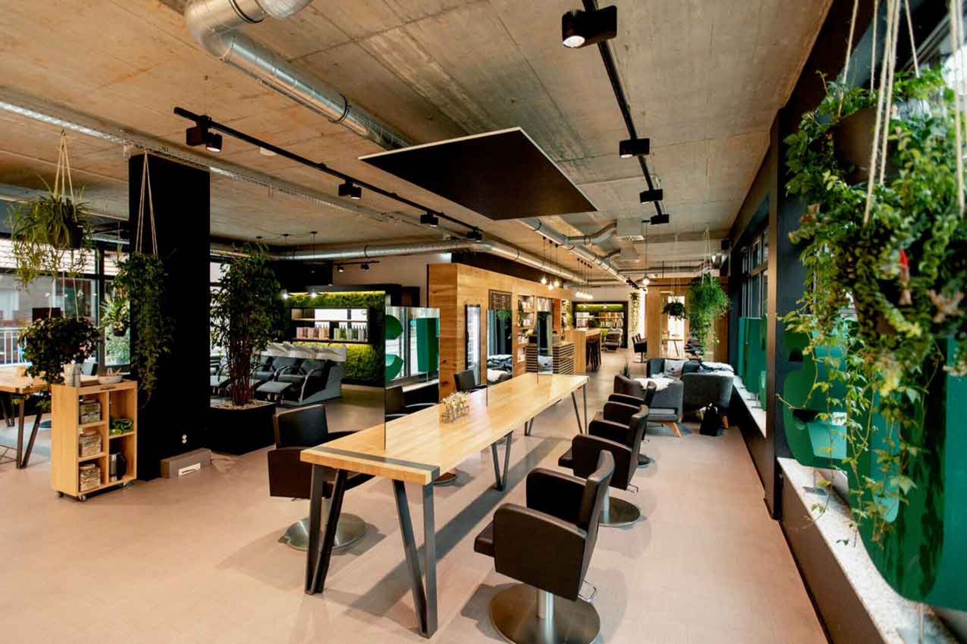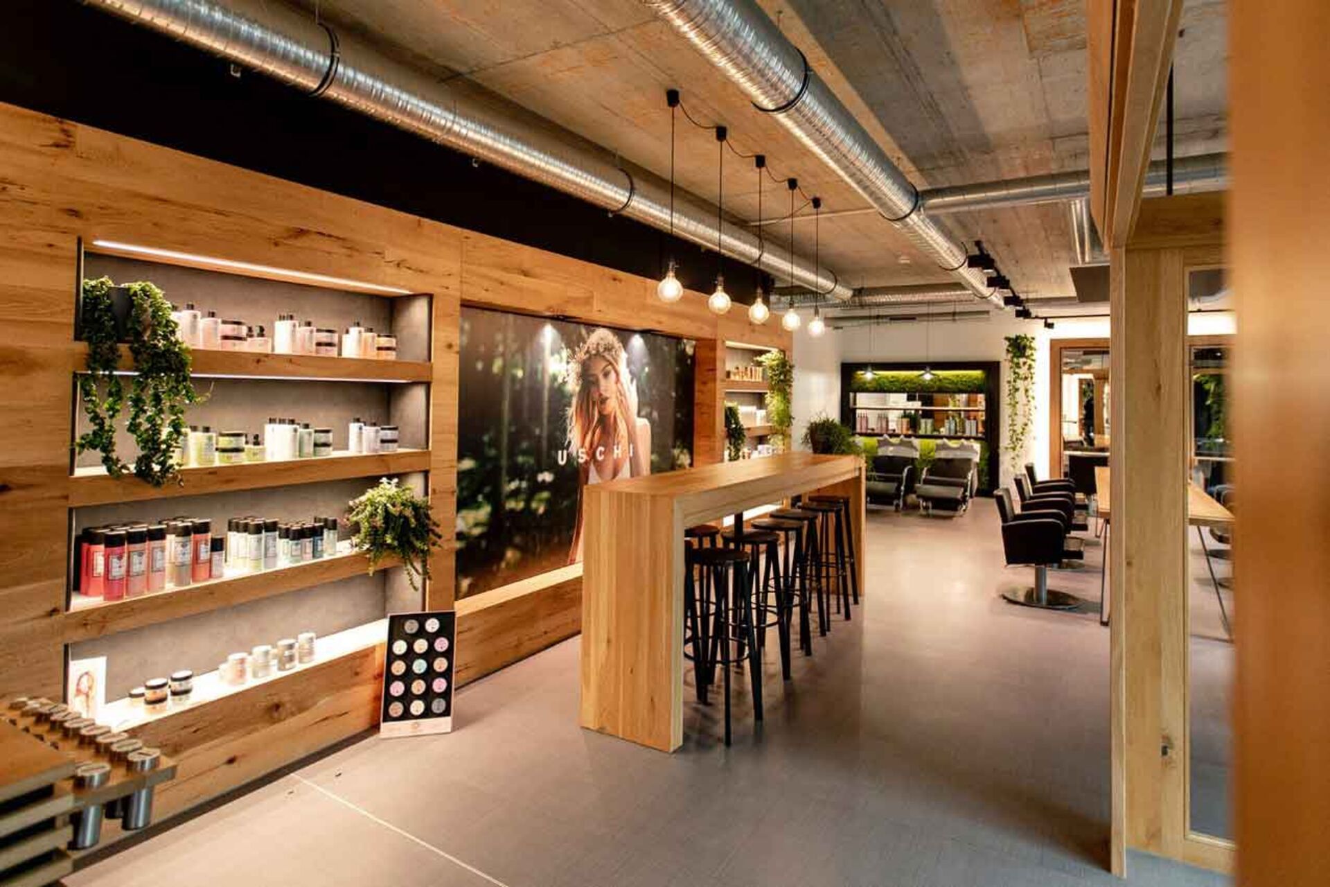 Das Mobiliar hergestellt aus natürlichen Materialien, wie z.B. aus Beton, Stahl und Holz zieren die Wände, Decken und Böden des Salons. Große Holzkästen, gefüllt mit veganen Haar-Produkten von Maria Nila und O&M, lange Frisiertische, die sich längst durch den Salon erstrecken und darüber Stahlrohre, die die Decke schmücken. Selbst die Stuhlüberzüge sind vegan.
