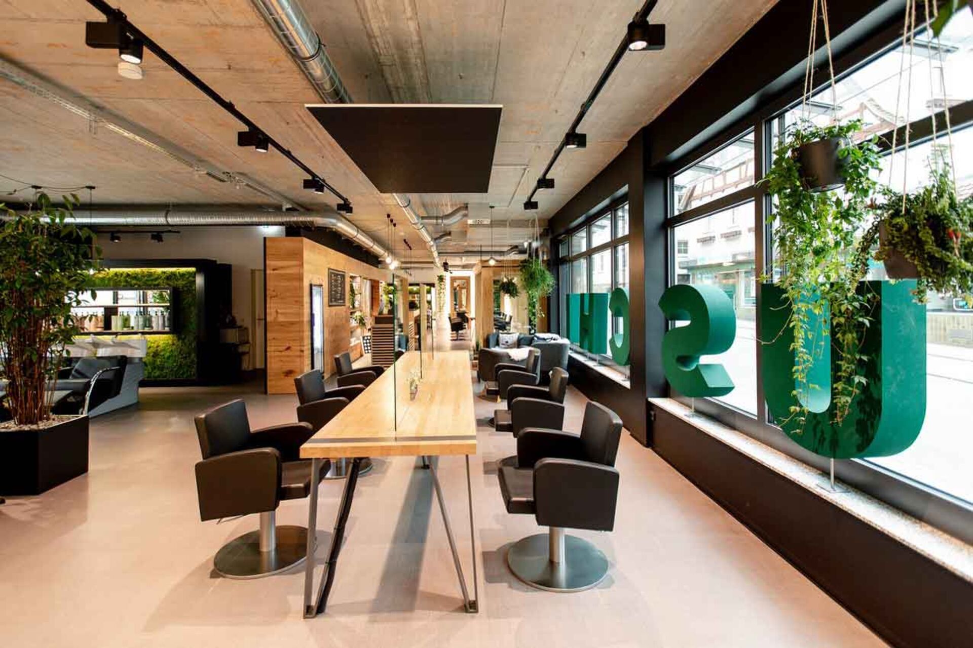 Von der Decke hängen viele grüne Pflanzen. Uschi Salons lieben Pflanzen, allerdings wollen sie selbstverständlich kein Wasser verschwenden. Deswegen entwickelten sie ein eigenes Bewässerungssystem für Gewächse, die nur geringe Mengen an Wasser verbrauchen. Wohin man auch nur blickt, überall sind die grünen Pflanzen fleißig am Wachsen.