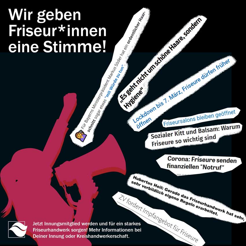Innungen, Landesinnungsverbände und der Zentralverband machen sich für ein zukunftsfähiges Friseurhandwerk stark und vertreten die Interessen ihrer Mitglieder gegenüber Regierung, Parlament, Ministerien und Behörden. Damit das Verbandswesen auch weiterhin für ein erfolgreiches Friseurhandwerk kämpfen kann, braucht es Unterstützung! Unter dem Motto 'Was Friseure können, können nur Friseure' wirbt der Zentralverband um Mitglieder. Den einzelnen Landesinnungen wird hierfür umfangreiches Werbematerial an die Hand gegeben