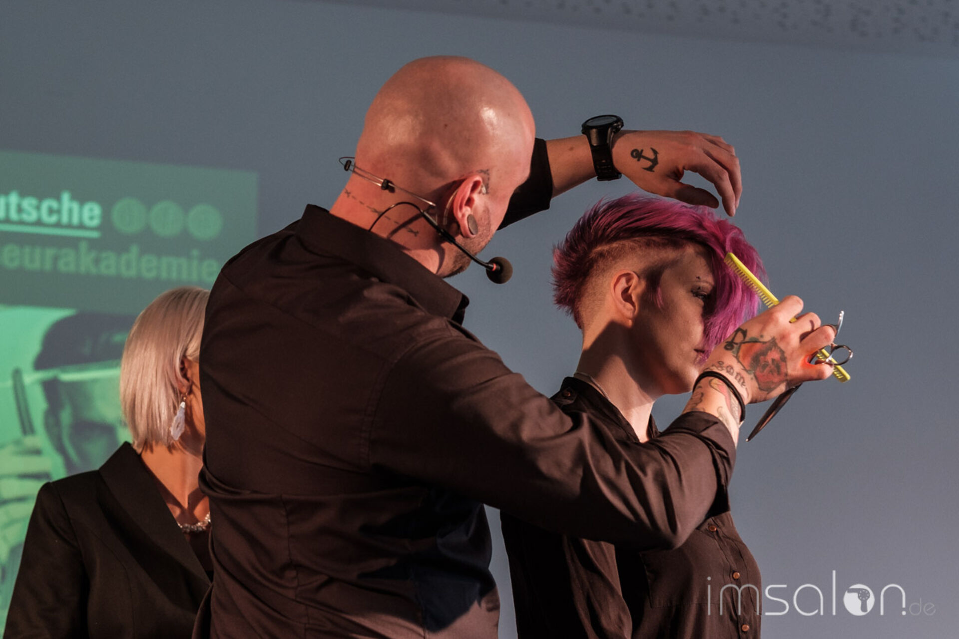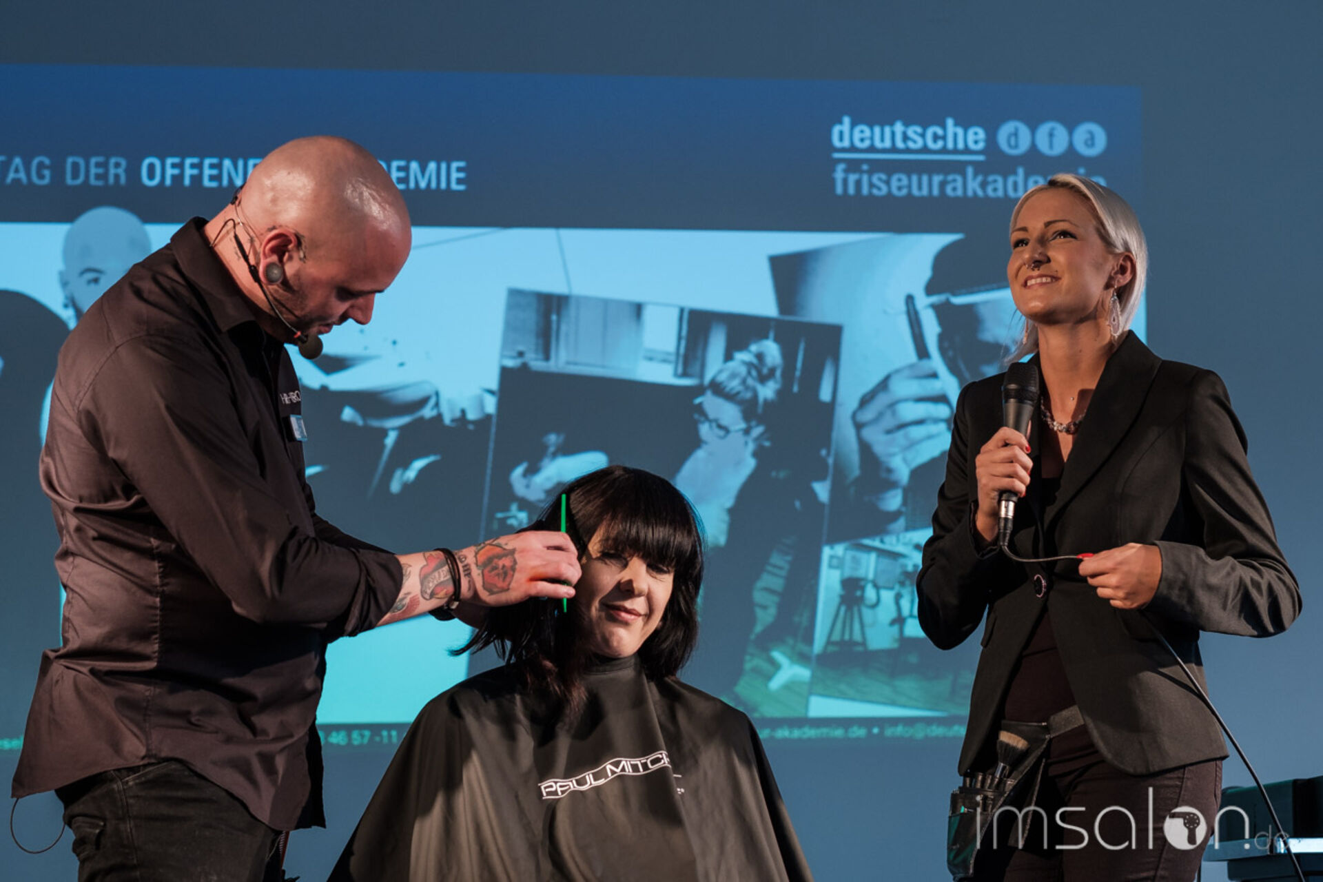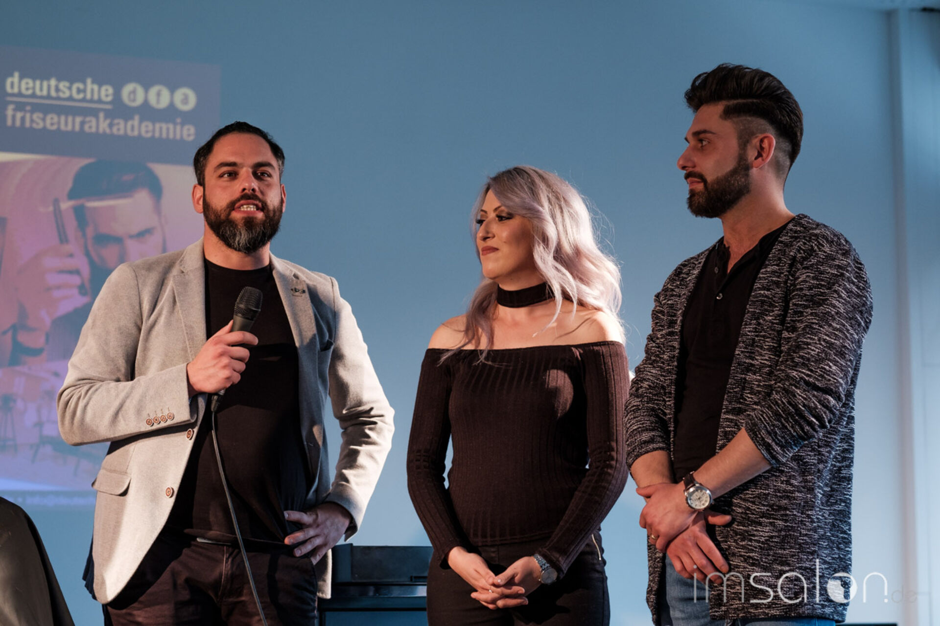 Die Trendausblicke mit dem dfa Artistic Director Mathias Napp komplettierte den Vormittag. Die neue dfa Kollektion Herbst/Winter 2017, an Live Modellen auf die Bühne gebracht. Hier an seiner Seite: Franziska Hurler, dfa Visagistin und Alexander Tsagarlis, Friseurmeister und beide angehende Friseur Trainer (HWK).