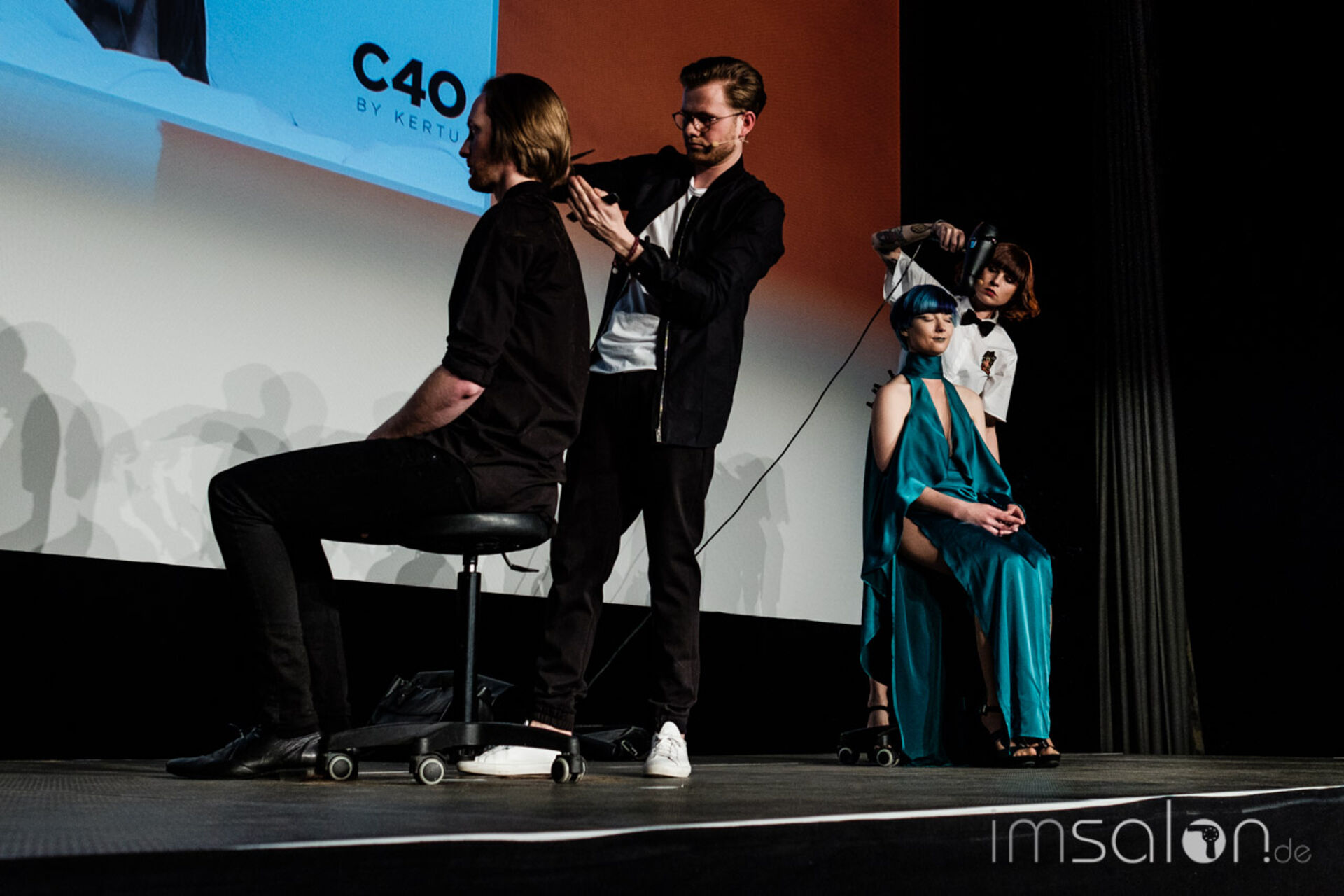 Auf der Bühne: Die KERTU Akteure Wilfried Pflüger, Janni Ossas, Ufuk Sahin, Karin Peta (Schnitt & Farbe) und Olivia Bucher(Langhaar-Kreationen)