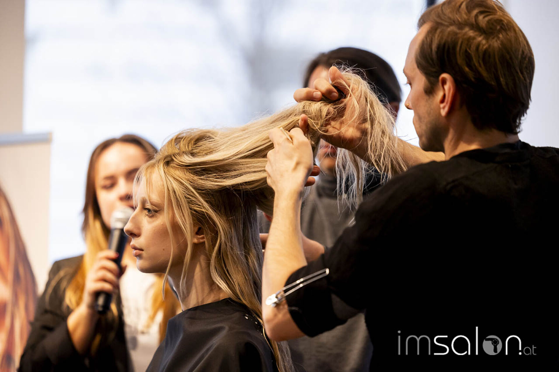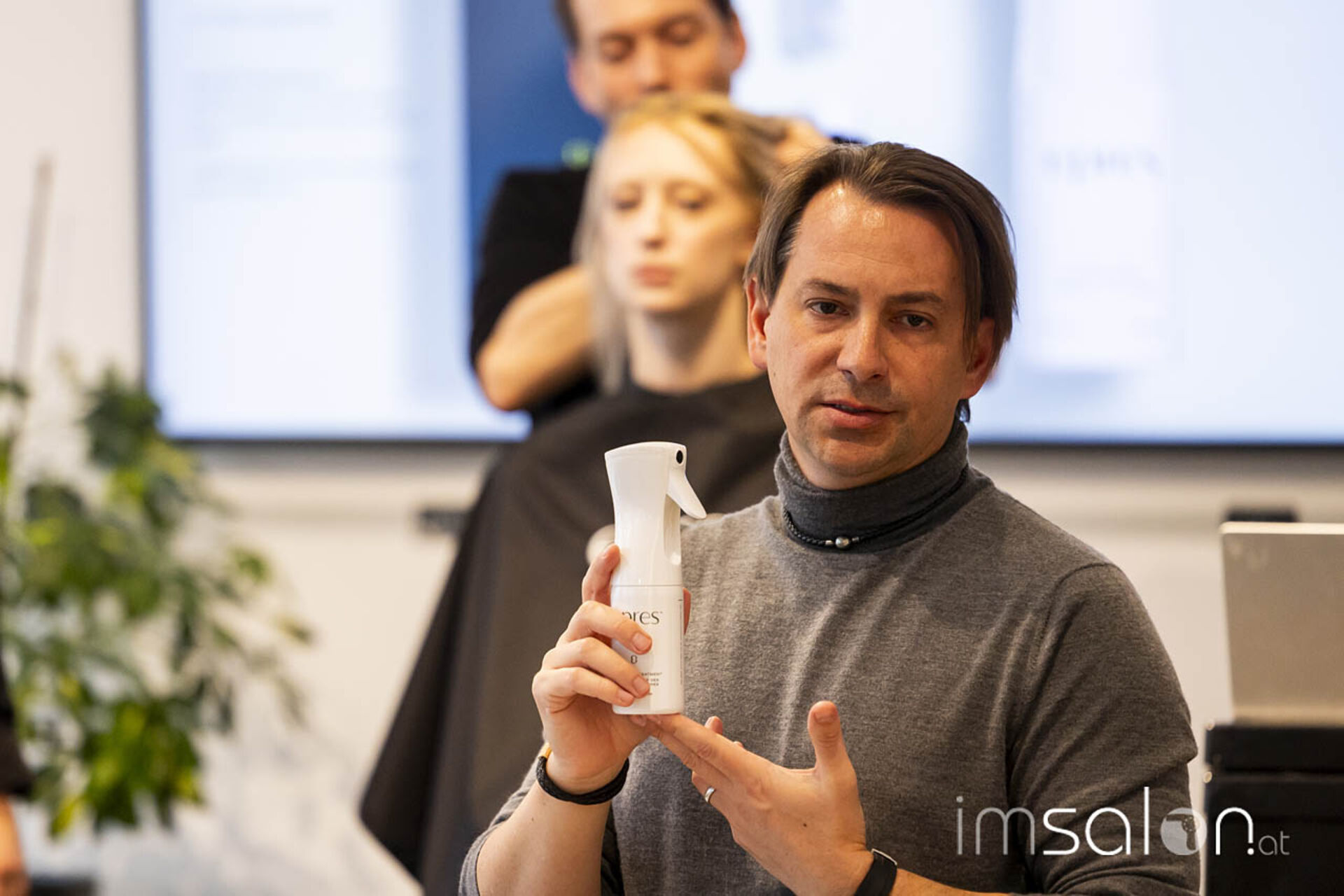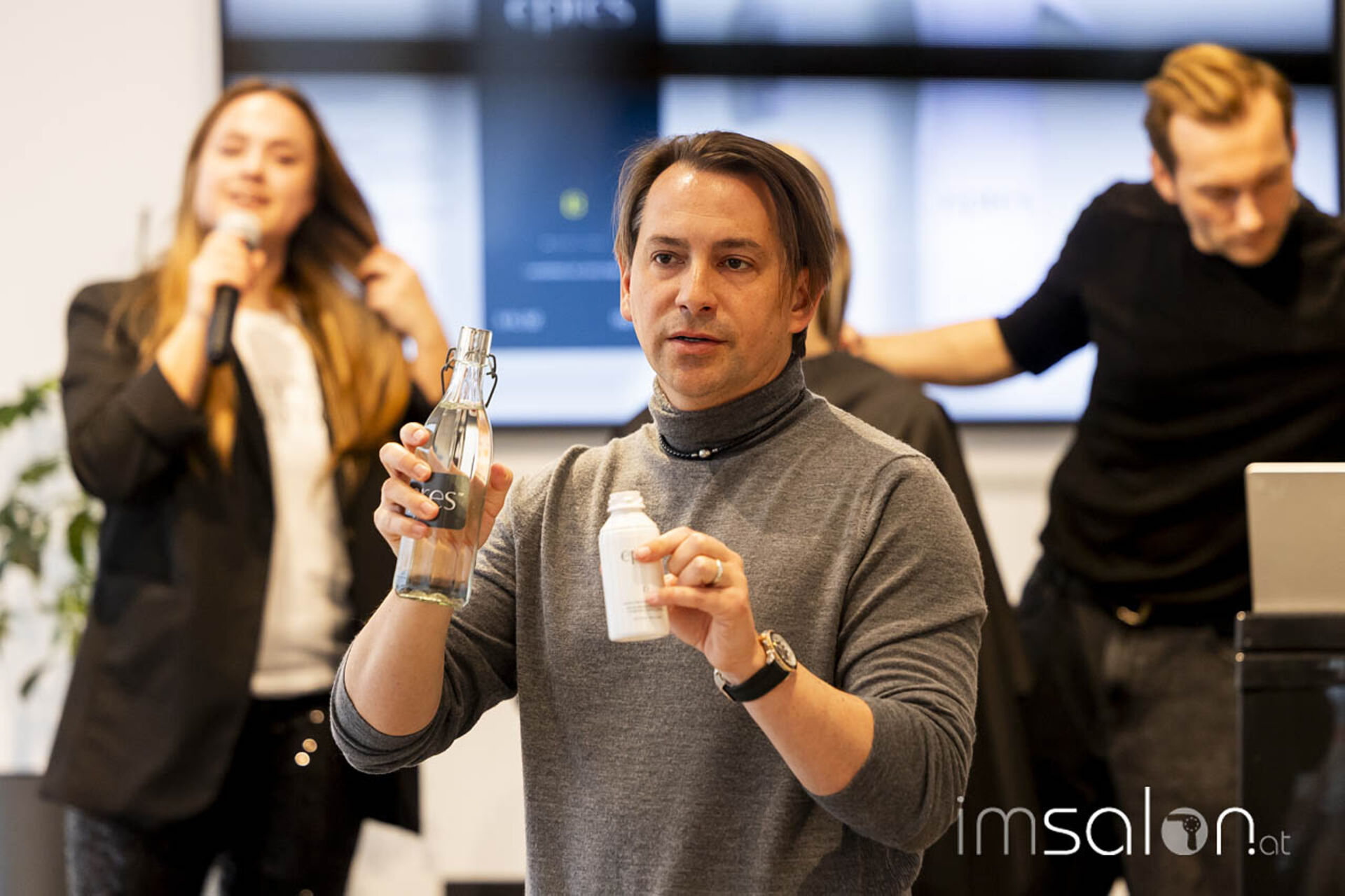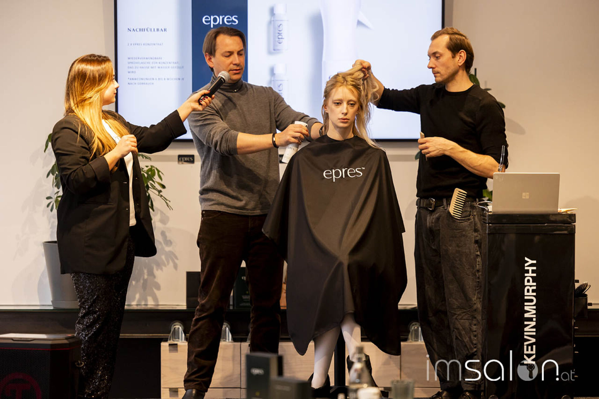 Das Handling und die Wirkungsweise von epres™ demonstriert Dr. Eric Pressly gemeinsam mit Florian Gepp (Salon Gebrüder Gepp Wien) an einem Modell. Gemischt wird die patentierte Lösung (Ampulle) mit Wasser und ins trockene oder feuchte Haar gesprüht. Nach einer Einwirkzeit von midestens 10 Minuten wird ausgespült und normal gestylt. Mischbar auch im Glossing, verspricht es bei einfacher Handhabung maximalen Pflegeeffekt. Wie das in der Parxis funktioniert, konnte direkt vor Ort getestet werden.