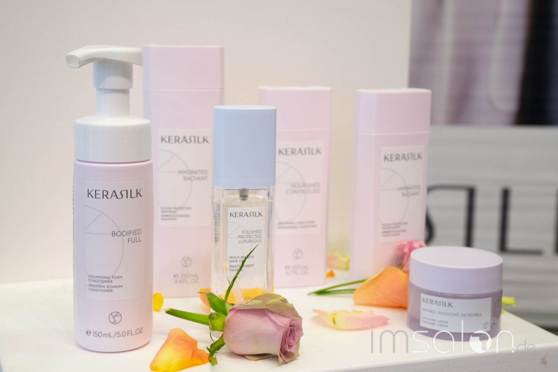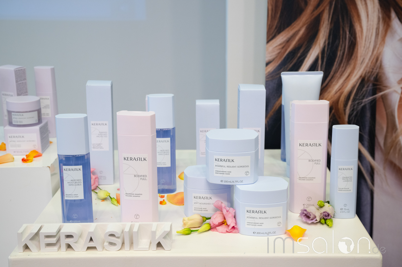 Die neue Kerasilk-Familie vereint insgesamt 30 Produkte, farblich sortiert in drei Kollektionen von hellblau über zartrosa bis hin zu leichtem Lila - von Specialist Produkten, die den ersten Zugang zur Kundin und zum Kunden legen, über die Essentials wie Shampoo und Conditioner sowie Stylingprodukte von Textur bis Volumen. Bergamotte, weißer Jasmin und Ambra sind die Zutaten für den Signature Duft, der sich durch alle Produkte zieht und mit nimmt auf die emotionale Wohlfühl-Reise.