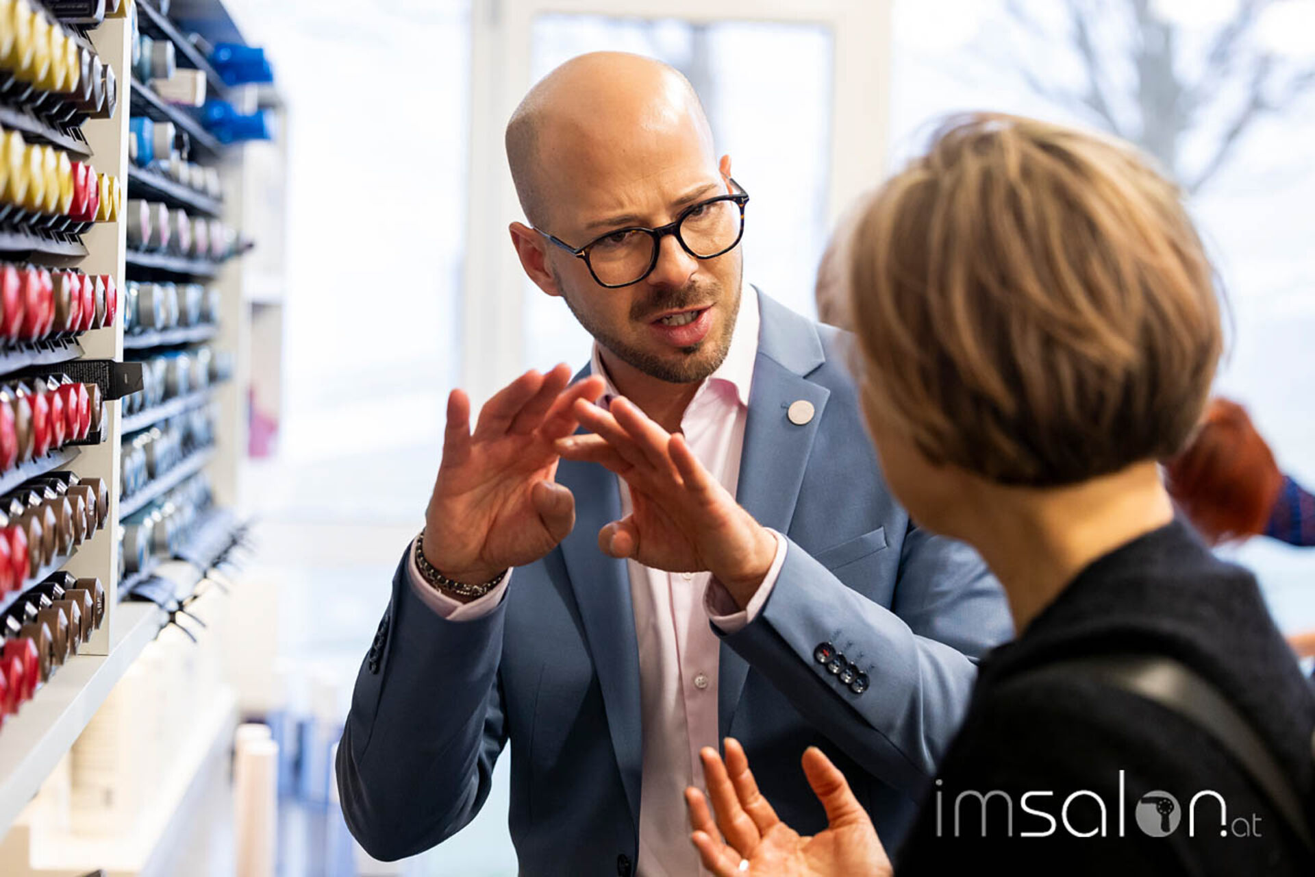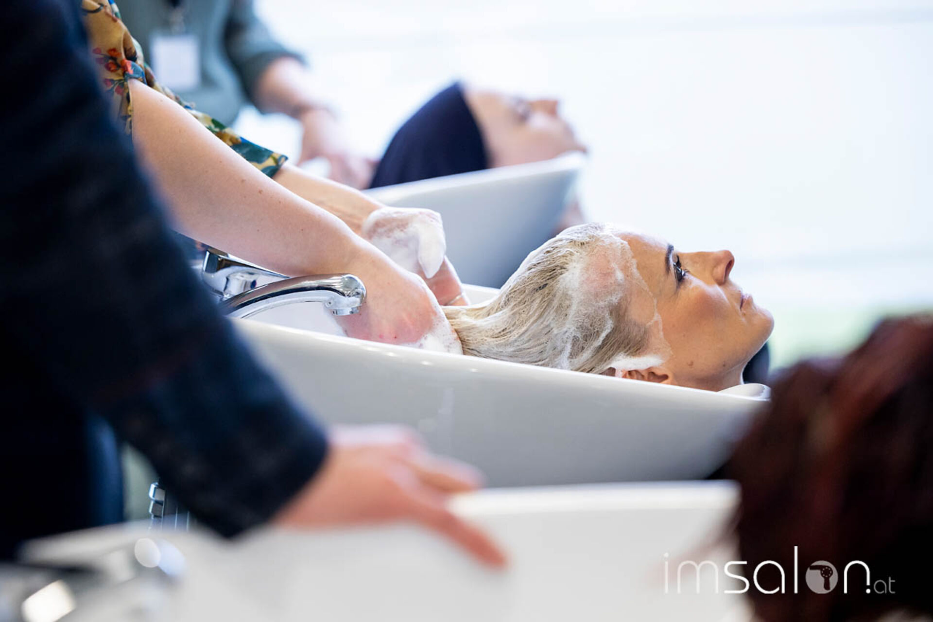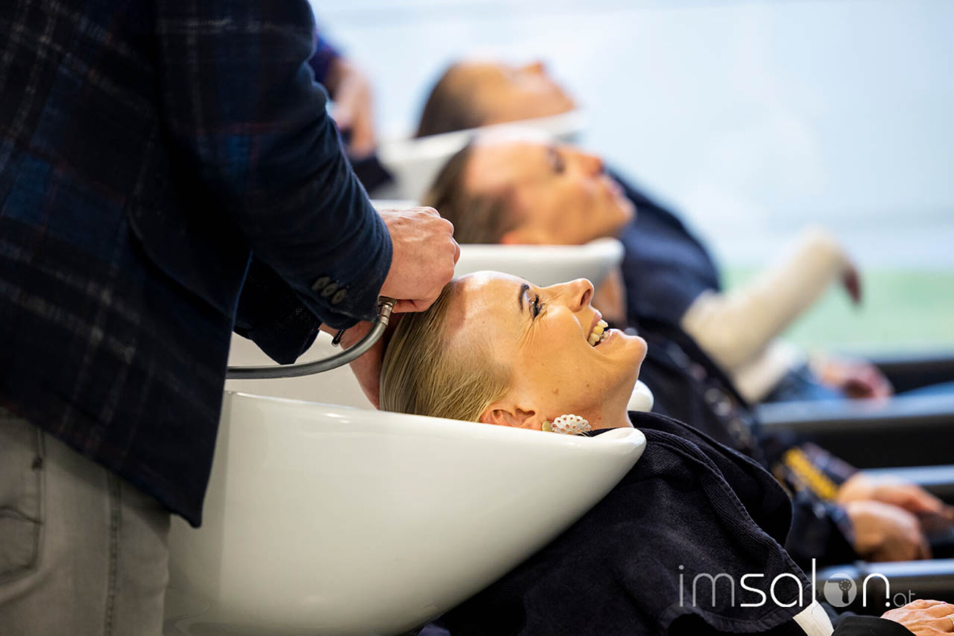 Für alle Teilnehmer*innen ging es später in den Praxisraum und an die Waschplätze. Jede und jeder hatte hier die Möglichkeit, sich in einem ersten Anwendungstest von all dem überzeugen zu können. Es wurde gegenseitig aufgetragen, gewaschen, gestylt und mit Kolleg*innen und den Fachtrainern gefachsimpelt.