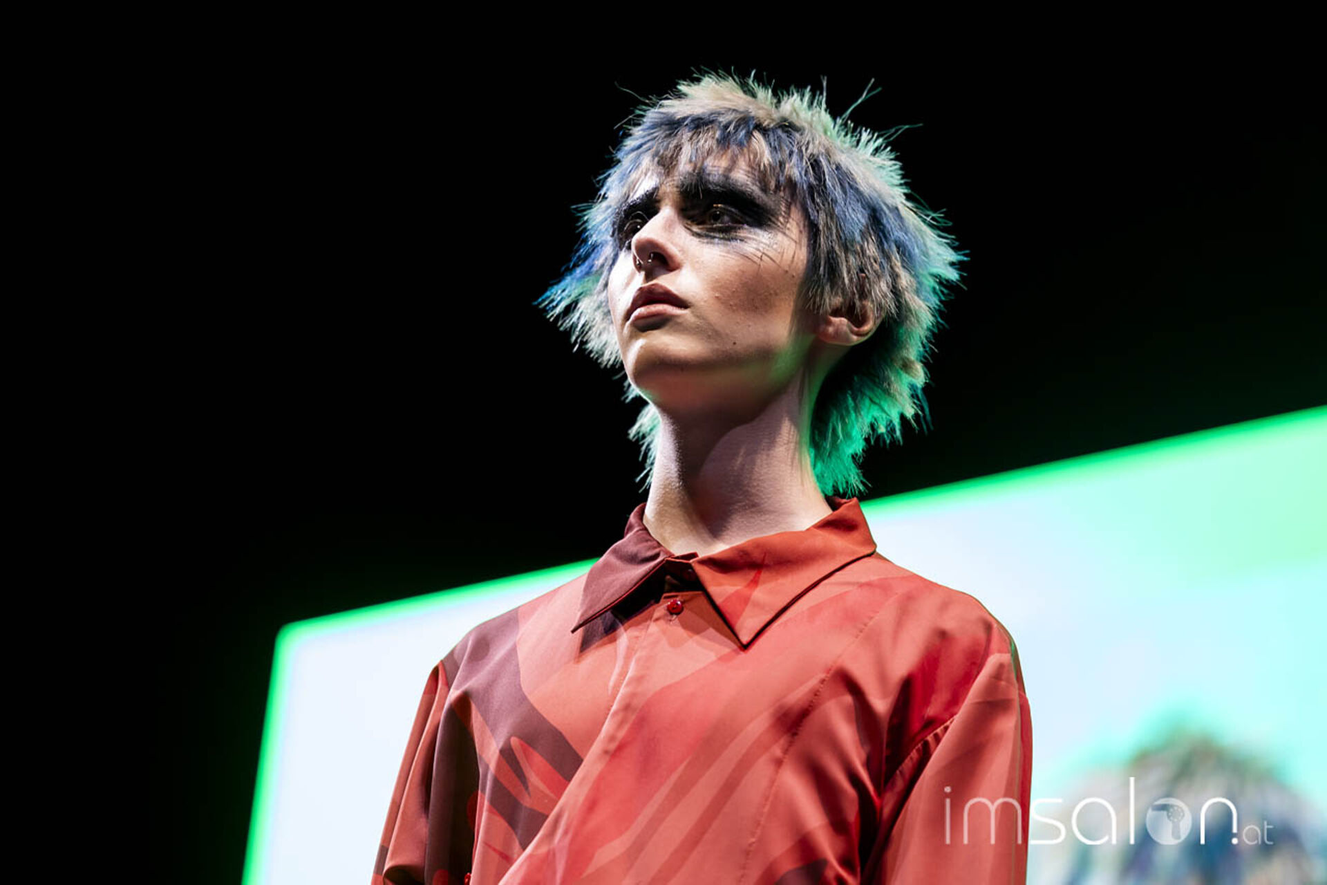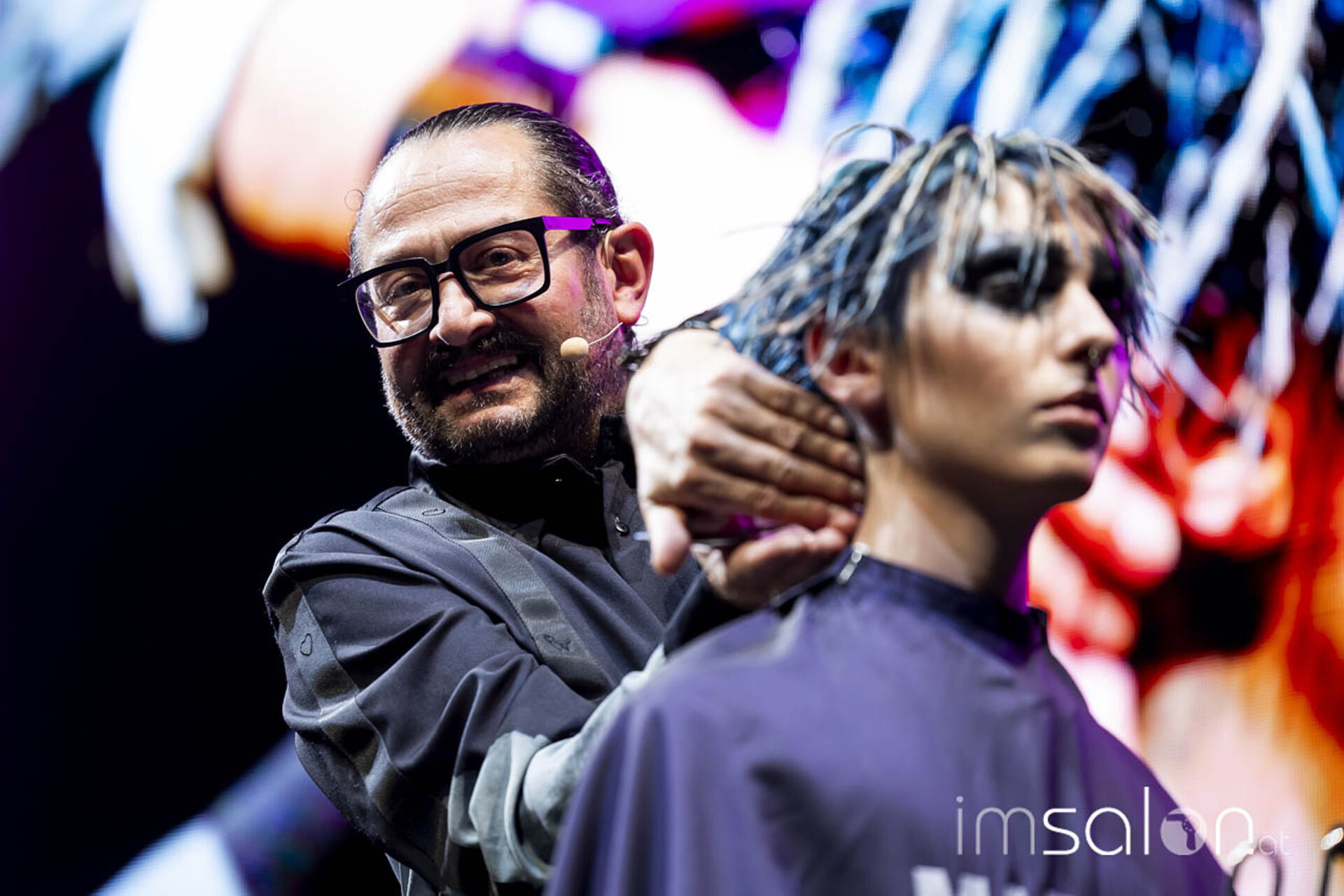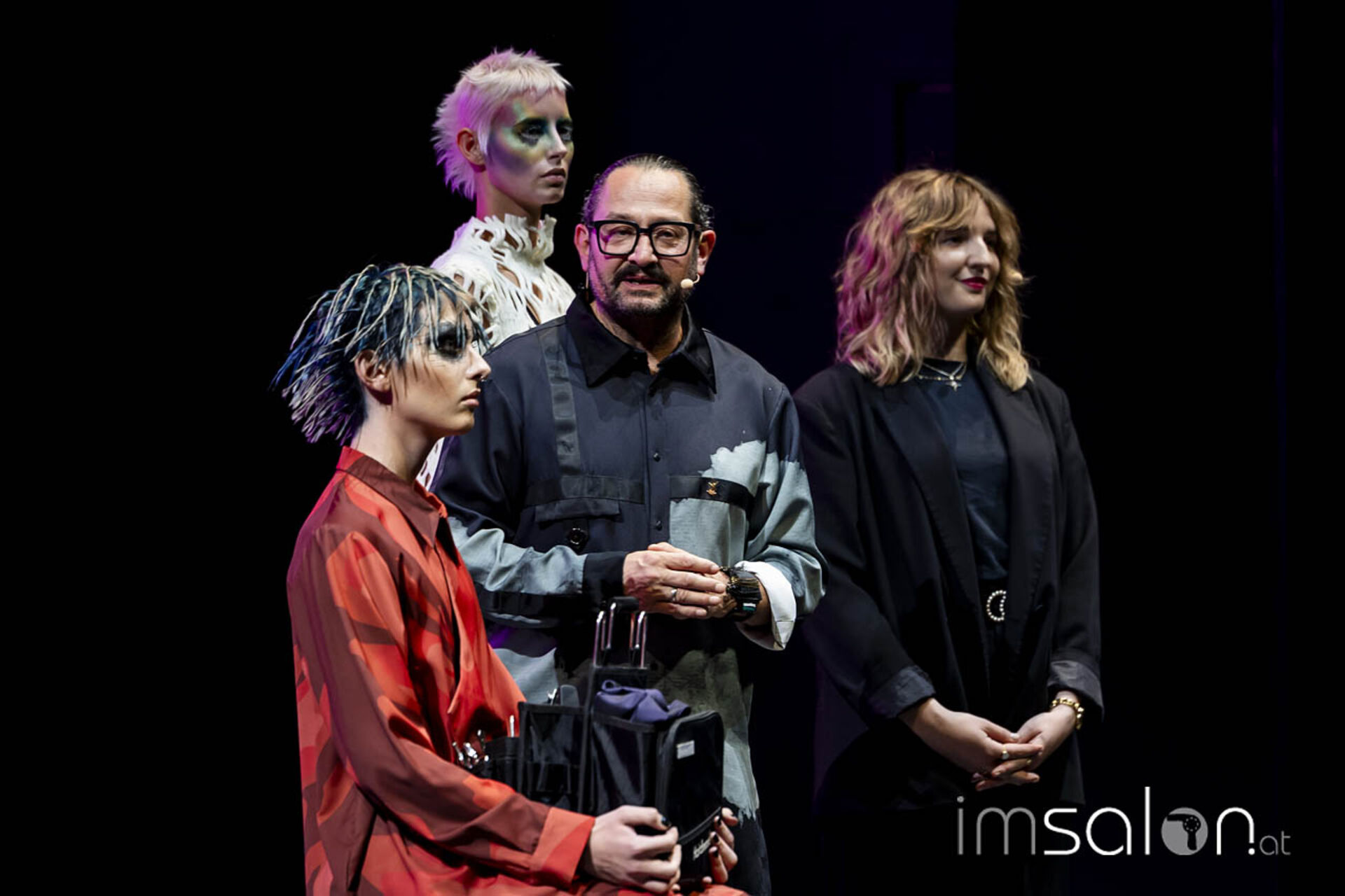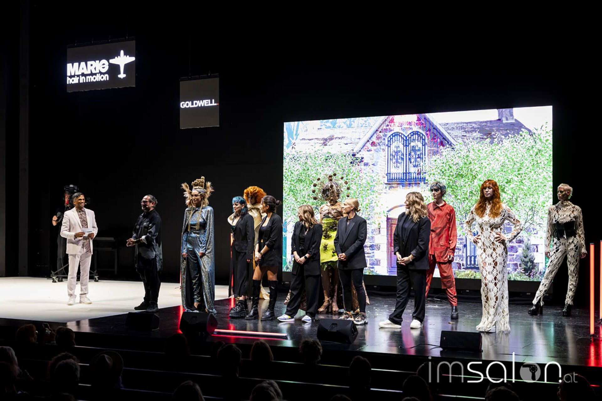 Eine Performance jagt die andere, wenn Mario Krankl auf der Bühne steht. Unter dem Motto „75 years of Goldwell“ ließ Mario Krankl die Gäste das „House of Hair“ entdecken. Dabei begegnet man Ballett-Tänzerinnen mit coolen Perückenlooks und futuristischen Haar-Helmen, und wenn Mario Krankl selbst die Bühne betritt, wartet er mit Schnitttechniken auf, die davor noch nicht gesehen wurden. Anna Seidl unterstützte Mario Krankl bei den Modellen in puncto Farbe – auch sie setzte für die Bühnen-Looks auf quadratische Abteilungen für spannende Ergebnisse.