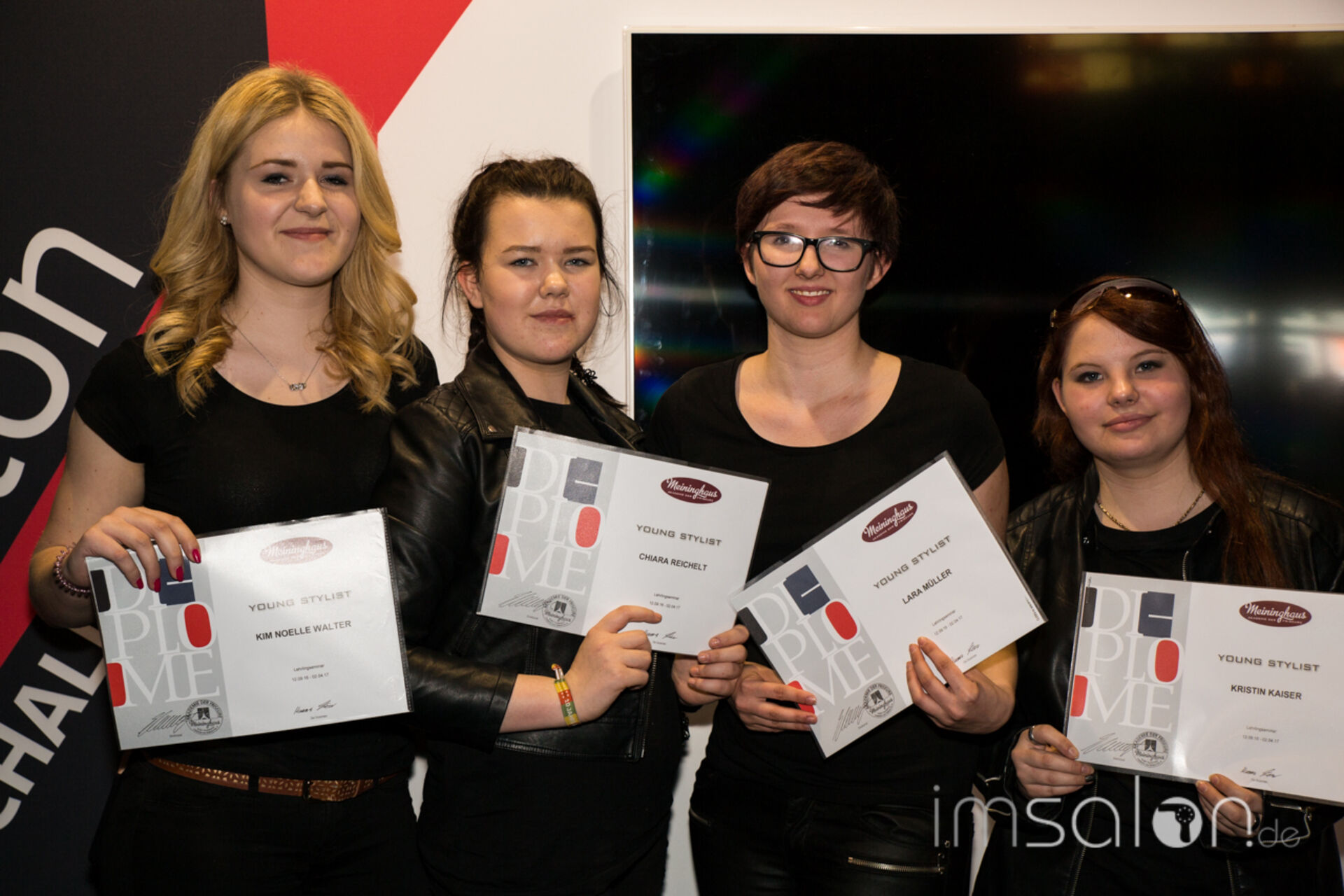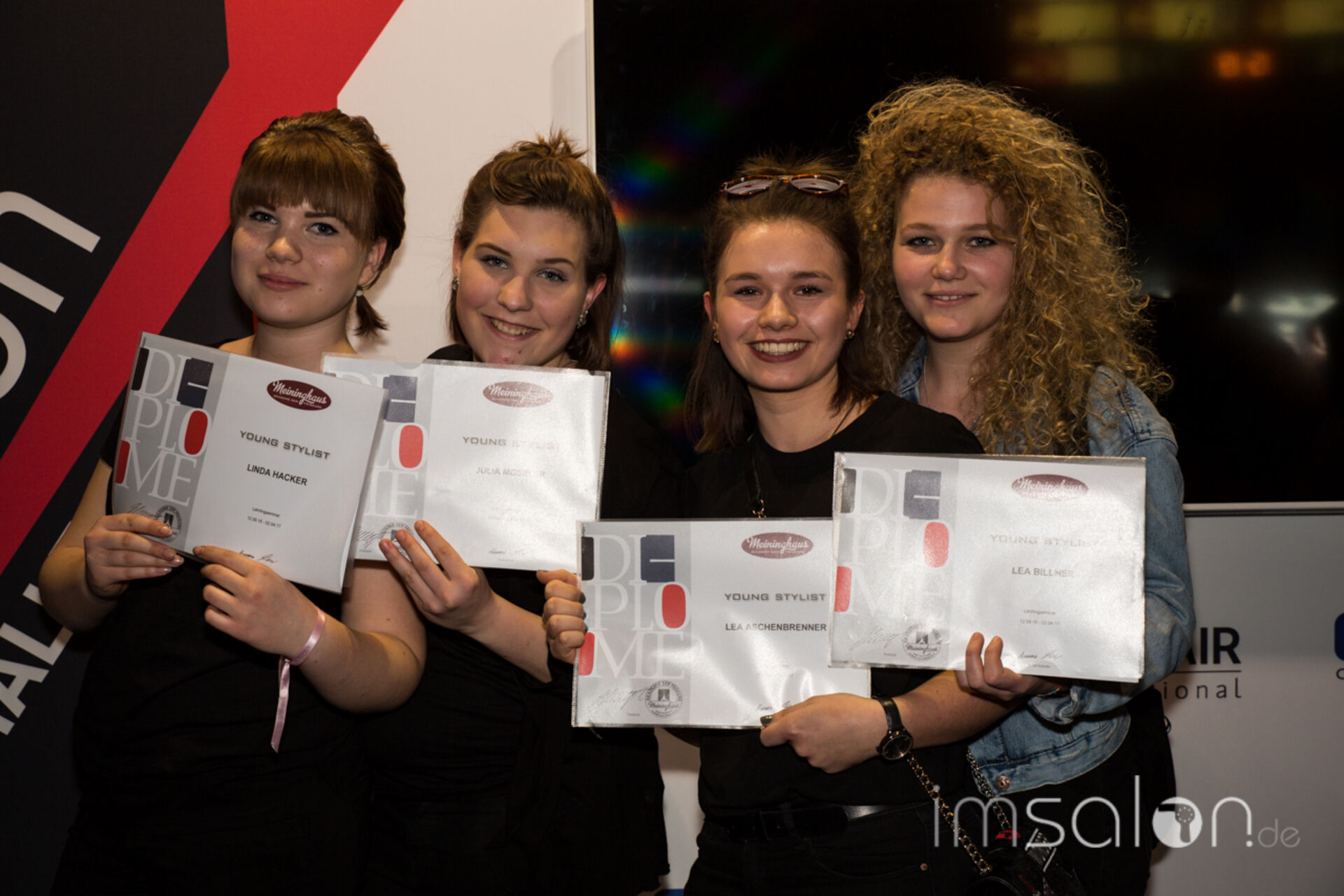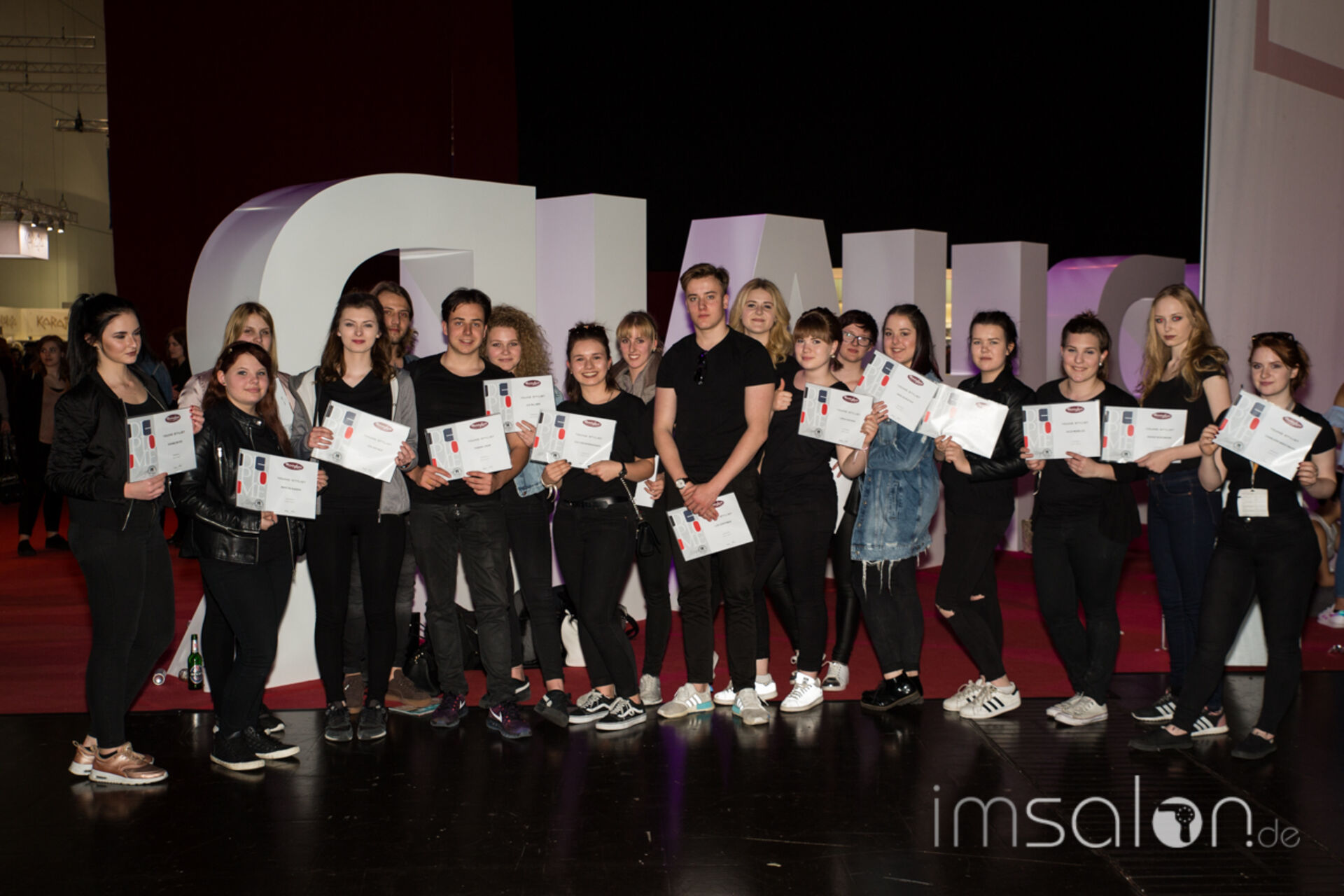 ►Axel Meininghaus, Gründer und Betreiber der Meininghaus Akademie der Friseure in Forchheim ehrt seine Auszubildenden auf der Wokshopbühne der TOP HAIR Messe und überreicht ihnen die Zertifikate zur bestandenen siebenmonatigen Ausbildung.