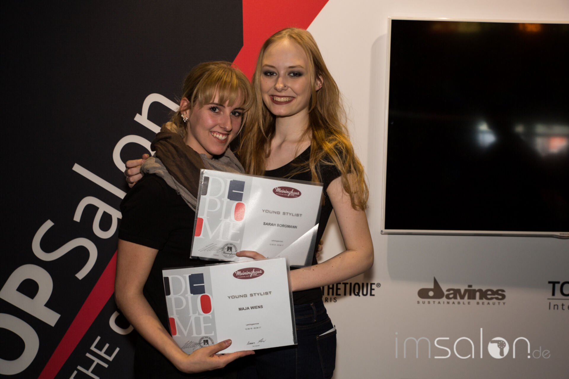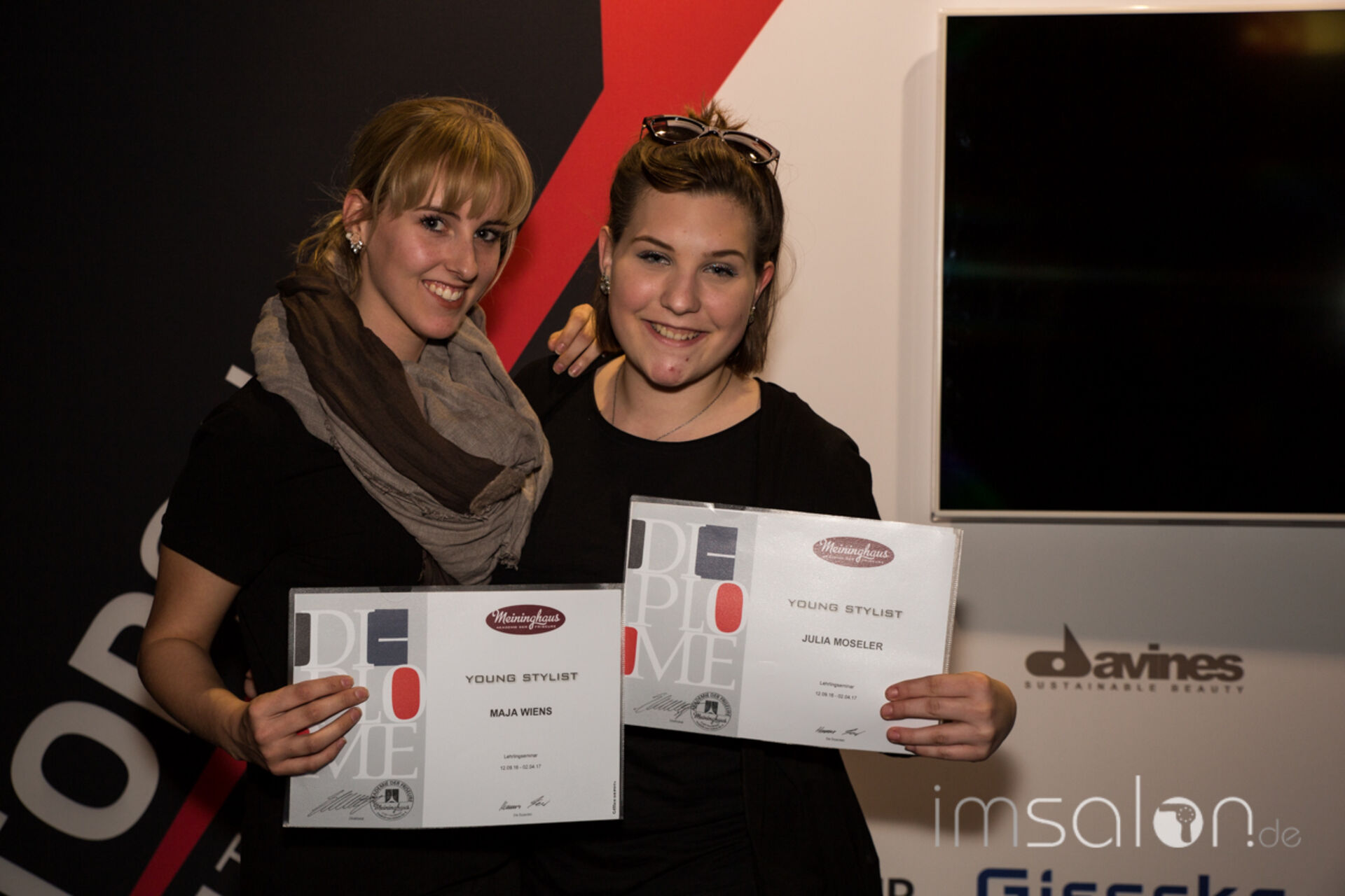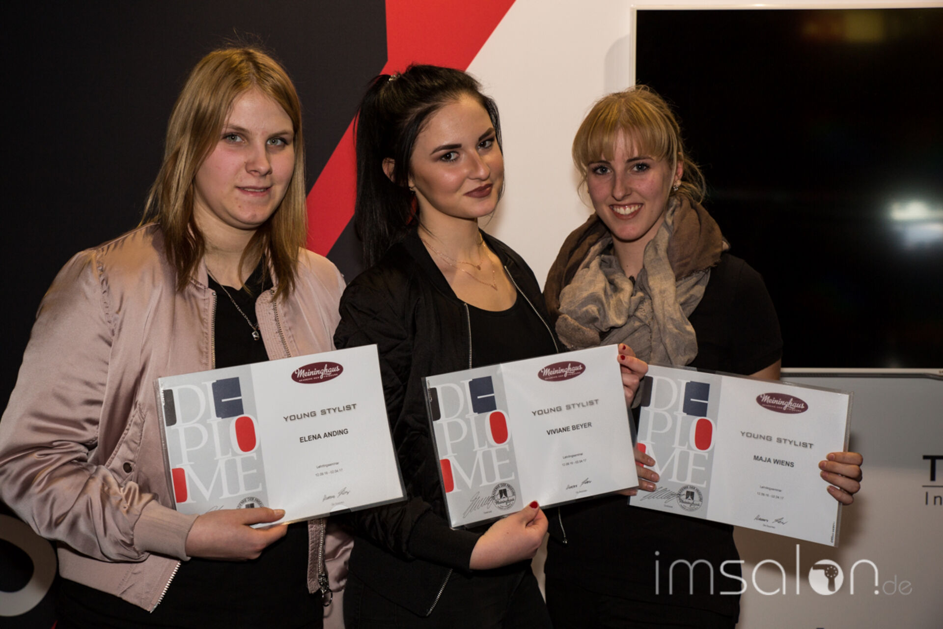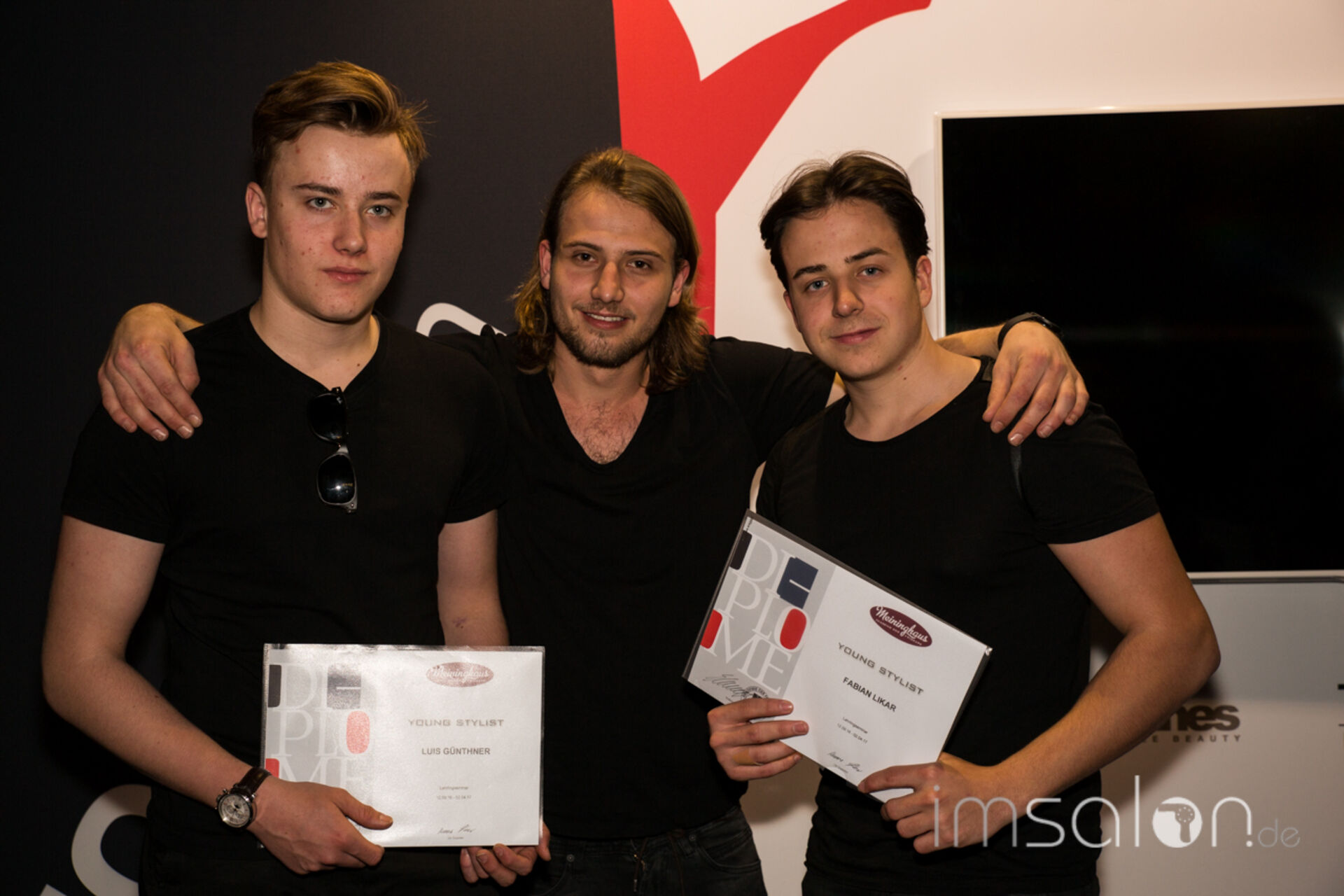 ►Axel Meininghaus, Gründer und Betreiber der Meininghaus Akademie der Friseure in Forchheim ehrt seine Auszubildenden auf der Wokshopbühne der TOP HAIR Messe und überreicht ihnen die Zertifikate zur bestandenen siebenmonatigen Ausbildung.