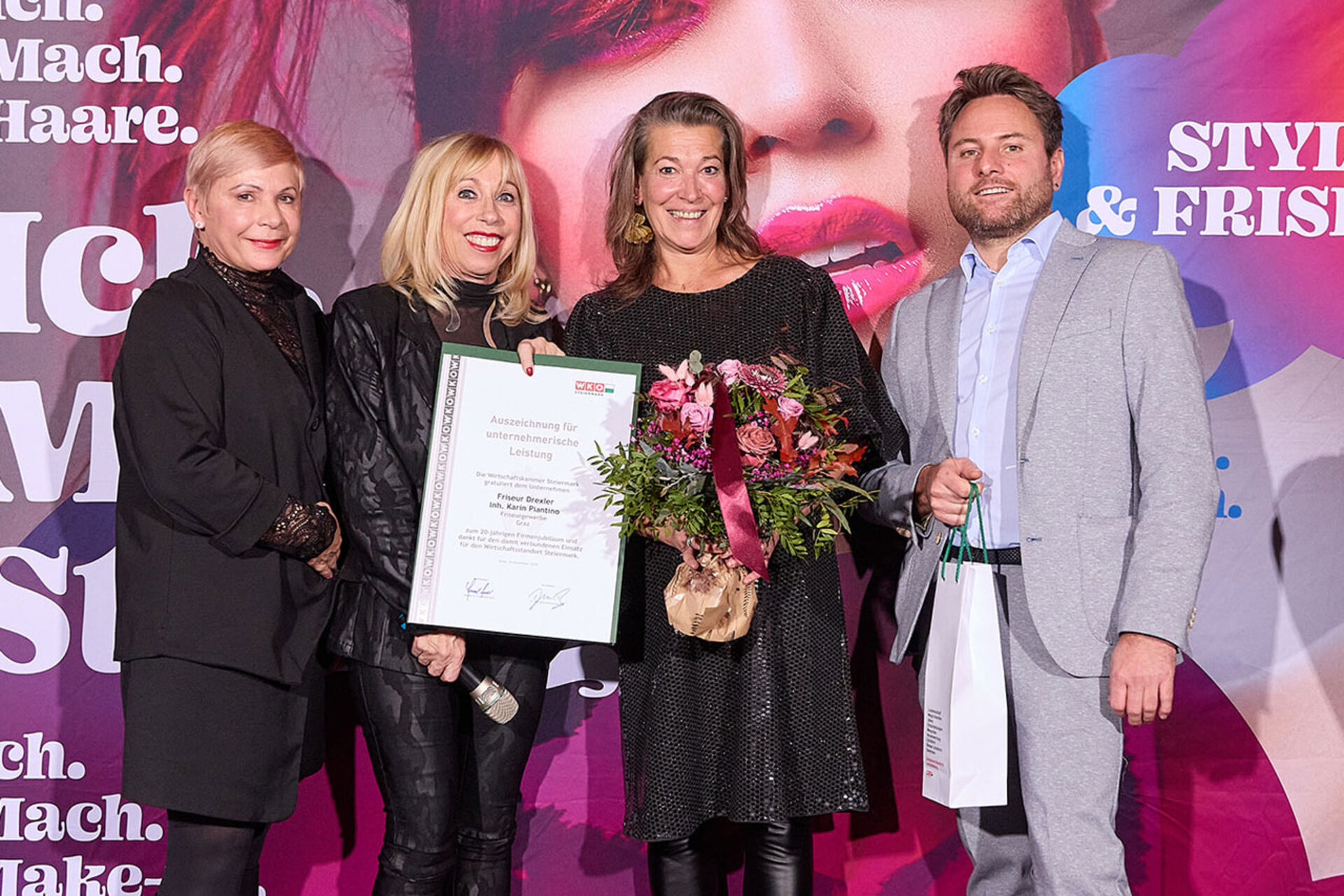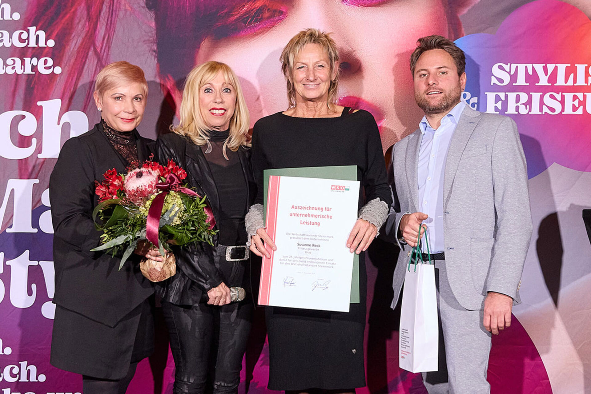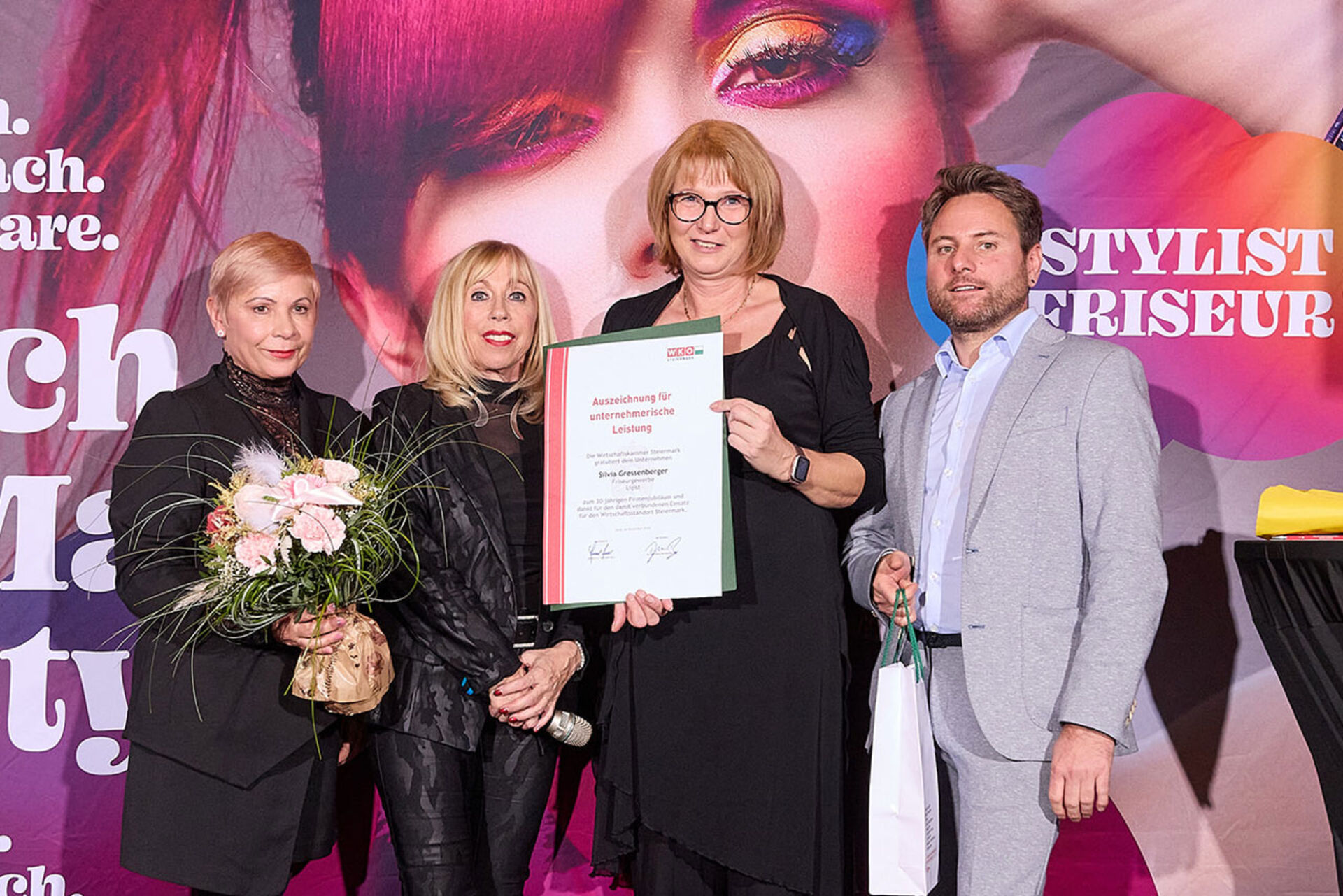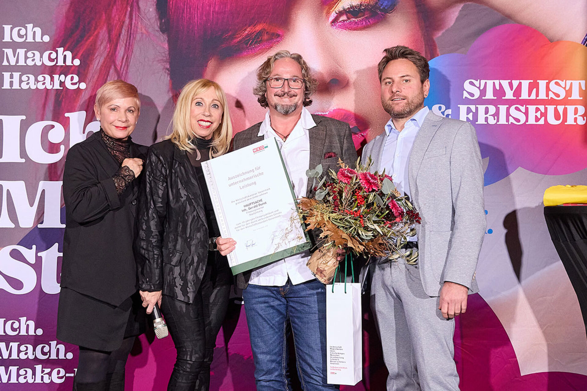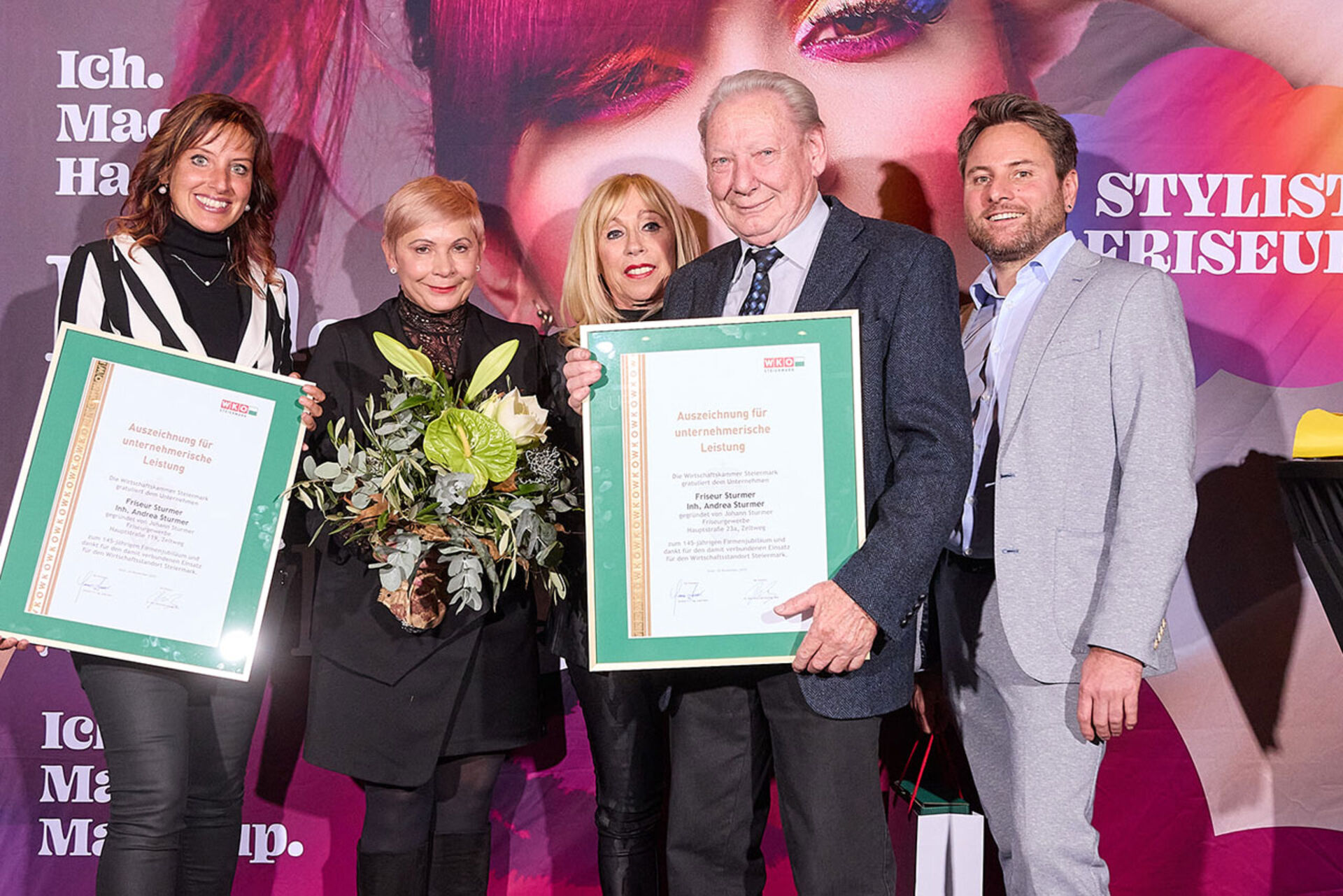 Beim ausgiebigen Dinner, guten Getränken und spürbar gelöster Stimmung wurde geplaudert, genetzwerkt und gemeinsam auf das angestoßen, was so oft im Alltag untergeht: Beständigkeit. Von 10 Jahren bis hin zu beeindruckenden 145 Jahren Unternehmensgeschichte reichte die Bühne – und damit auch die Gänsehaut-Momente. Auffällig (und irgendwie passend): Die steirische Friseur-Unternehmenskultur zeigte sich an diesem Abend klar weiblich geprägt – mit überwiegend Unternehmerinnen, die ihre Urkunden entgegennahmen.