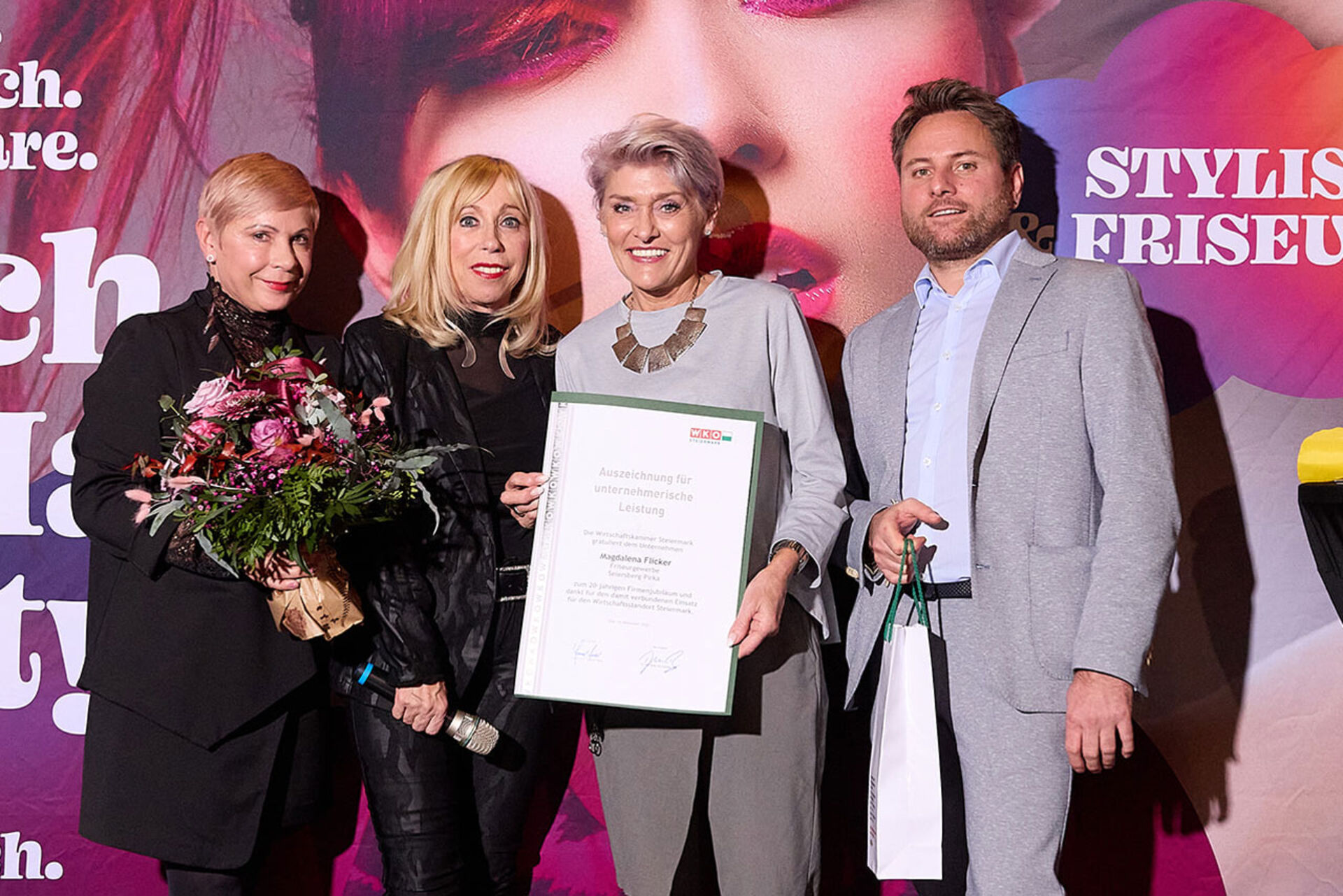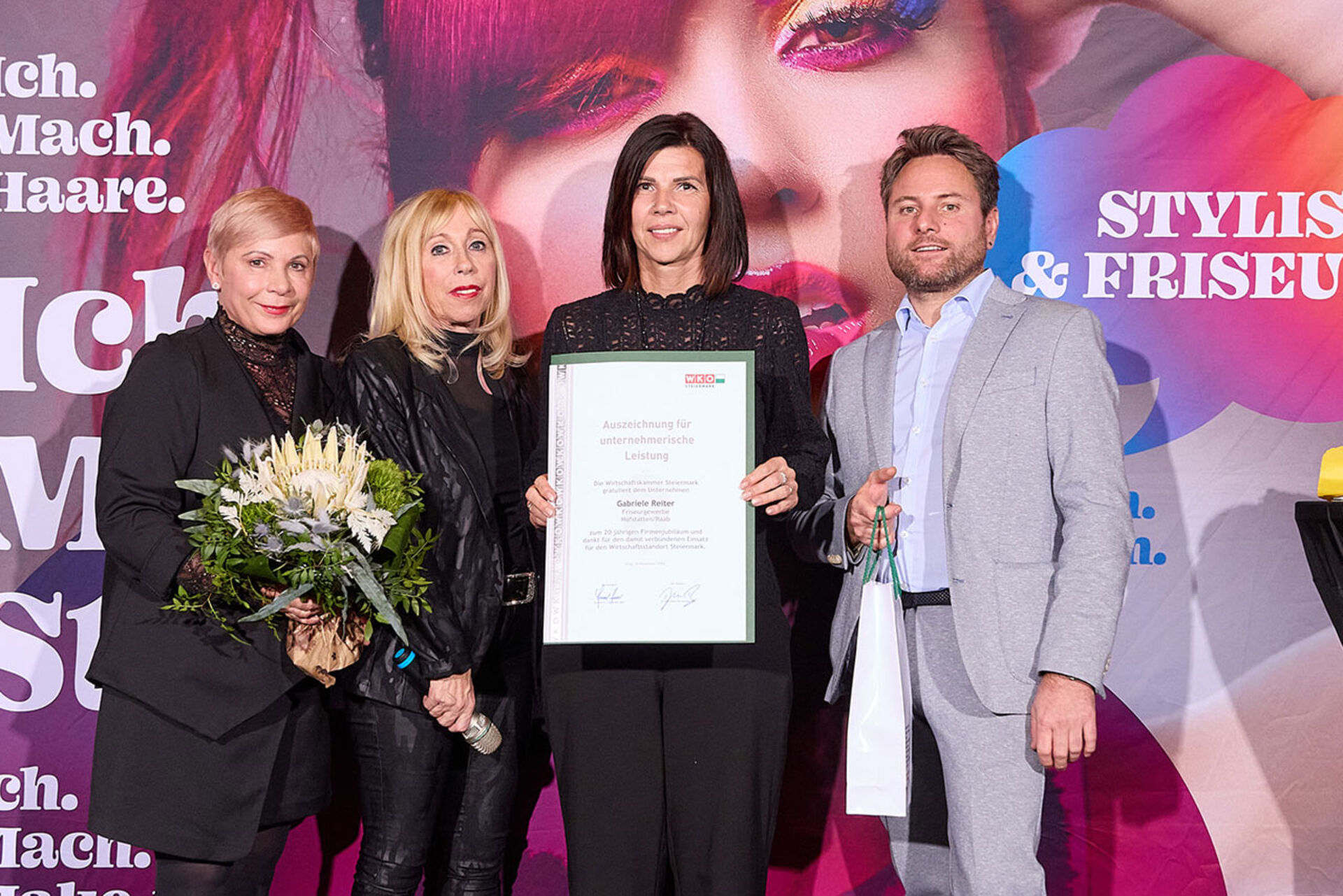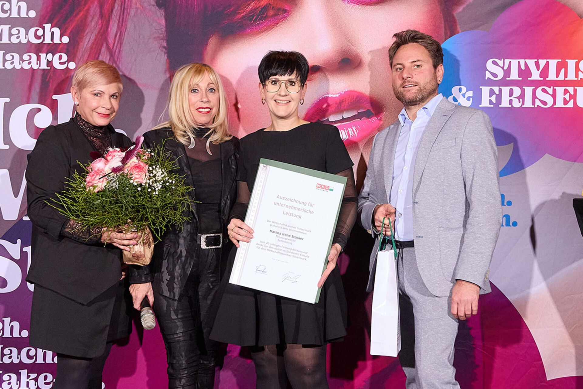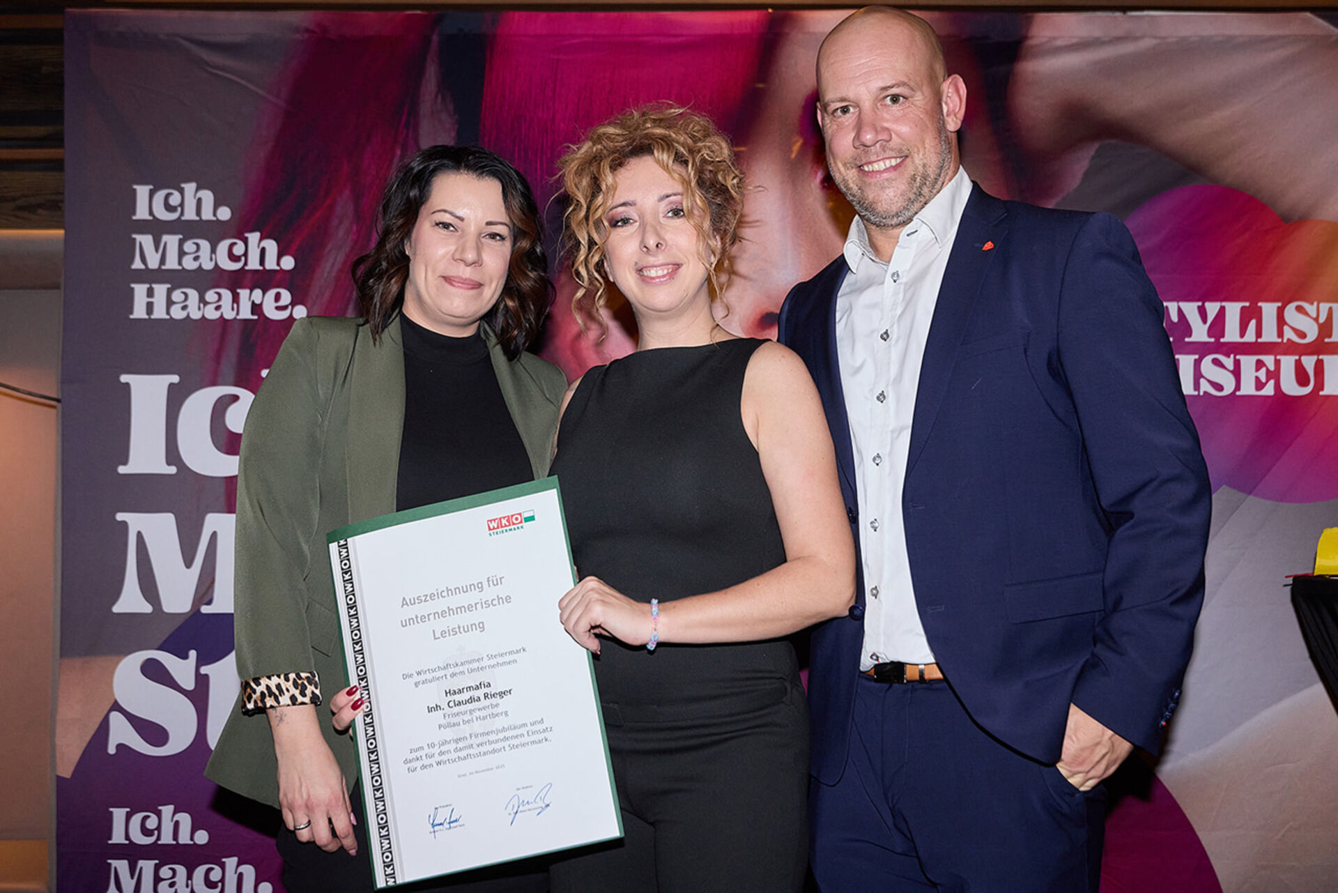 Beim ausgiebigen Dinner, guten Getränken und spürbar gelöster Stimmung wurde geplaudert, genetzwerkt und gemeinsam auf das angestoßen, was so oft im Alltag untergeht: Beständigkeit. Von 10 Jahren bis hin zu beeindruckenden 145 Jahren Unternehmensgeschichte reichte die Bühne – und damit auch die Gänsehaut-Momente. Auffällig (und irgendwie passend): Die steirische Friseur-Unternehmenskultur zeigte sich an diesem Abend klar weiblich geprägt – mit überwiegend Unternehmerinnen, die ihre Urkunden entgegennahmen.