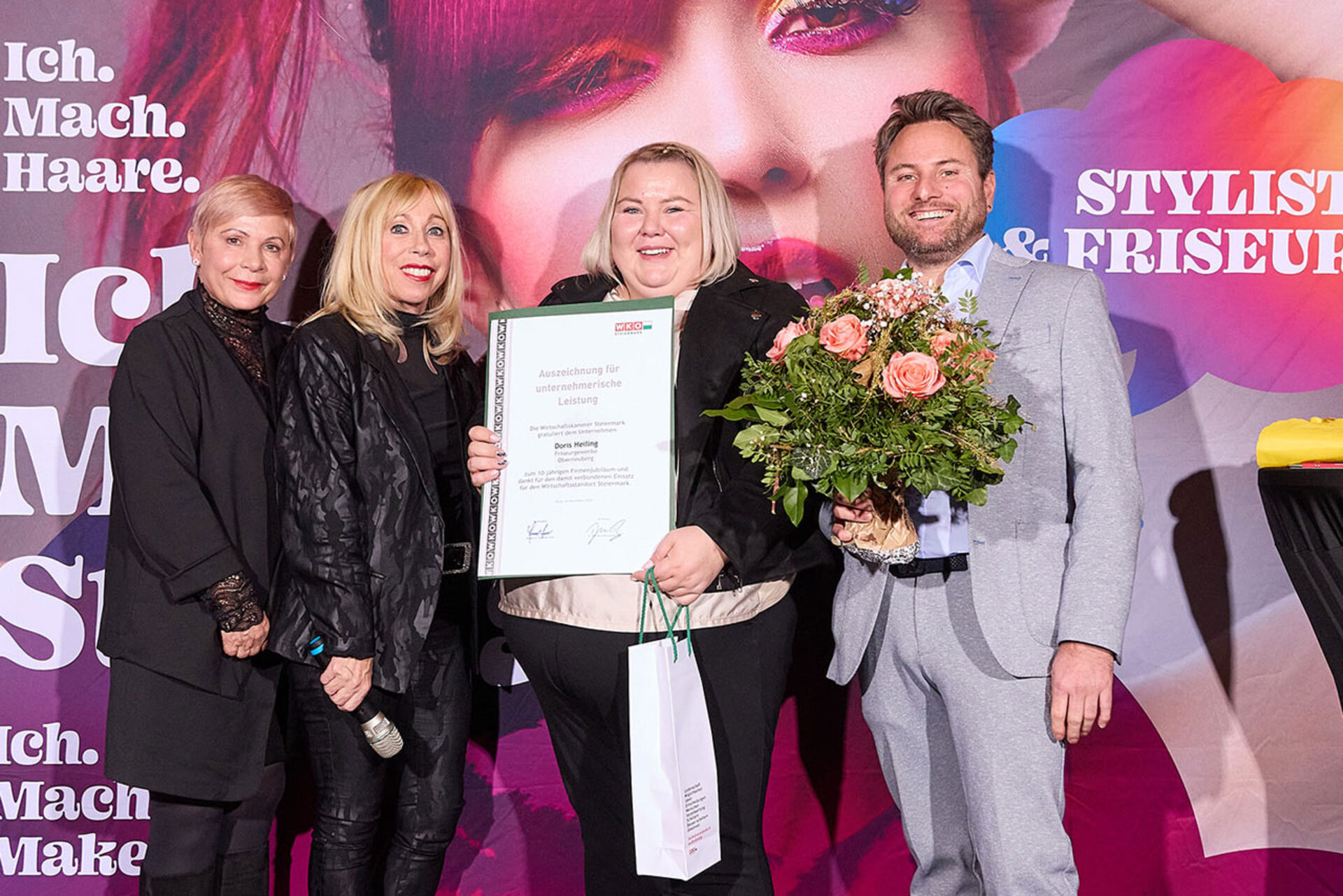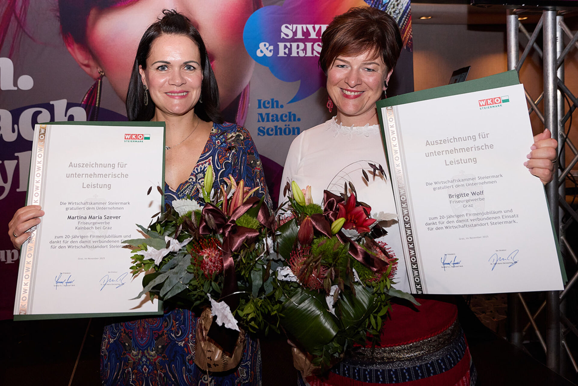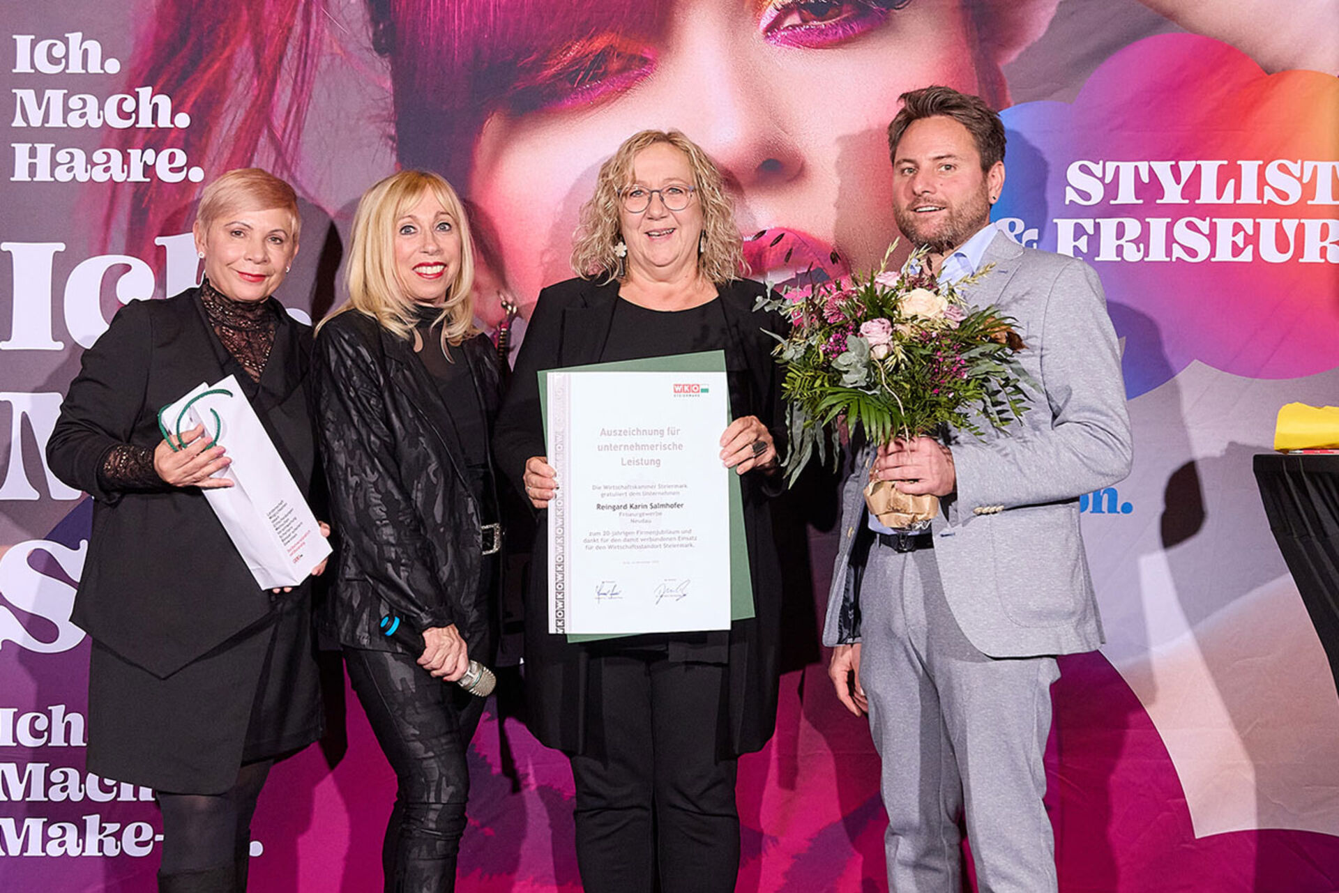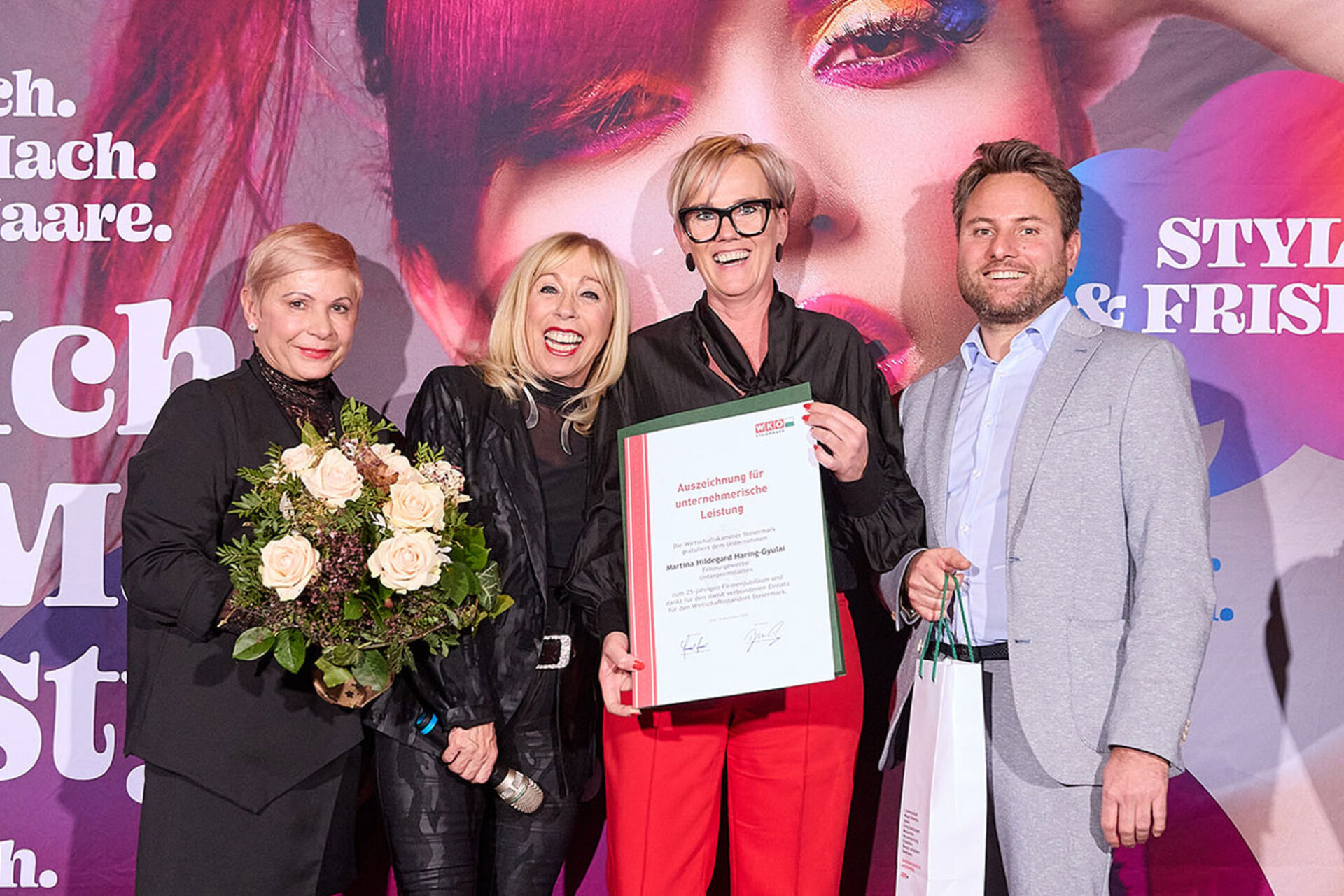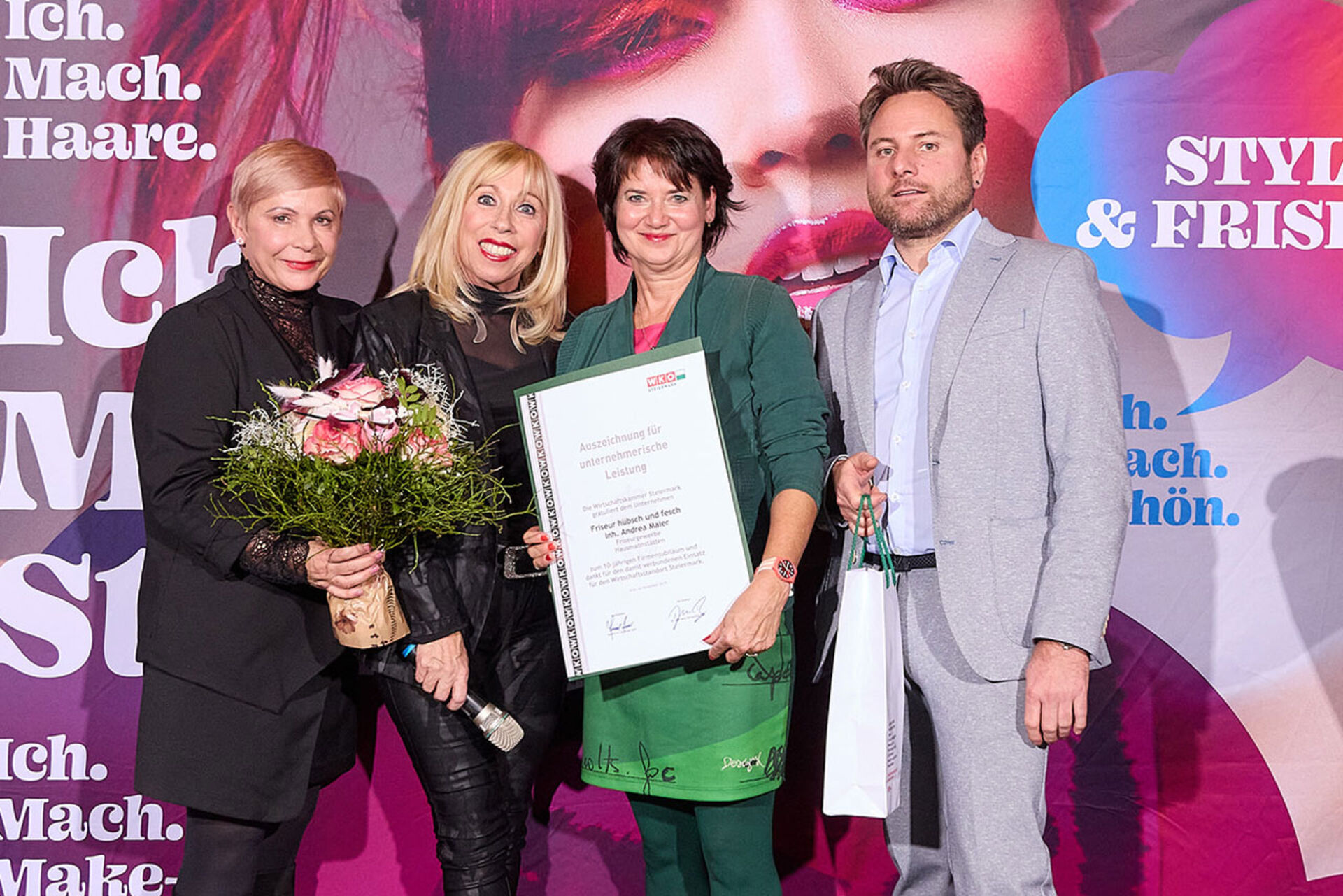 Beim ausgiebigen Dinner, guten Getränken und spürbar gelöster Stimmung wurde geplaudert, genetzwerkt und gemeinsam auf das angestoßen, was so oft im Alltag untergeht: Beständigkeit. Von 10 Jahren bis hin zu beeindruckenden 145 Jahren Unternehmensgeschichte reichte die Bühne – und damit auch die Gänsehaut-Momente. Auffällig (und irgendwie passend): Die steirische Friseur-Unternehmenskultur zeigte sich an diesem Abend klar weiblich geprägt – mit überwiegend Unternehmerinnen, die ihre Urkunden entgegennahmen.