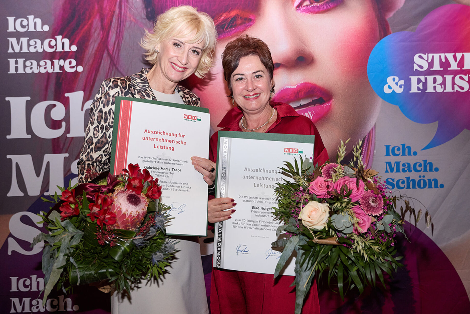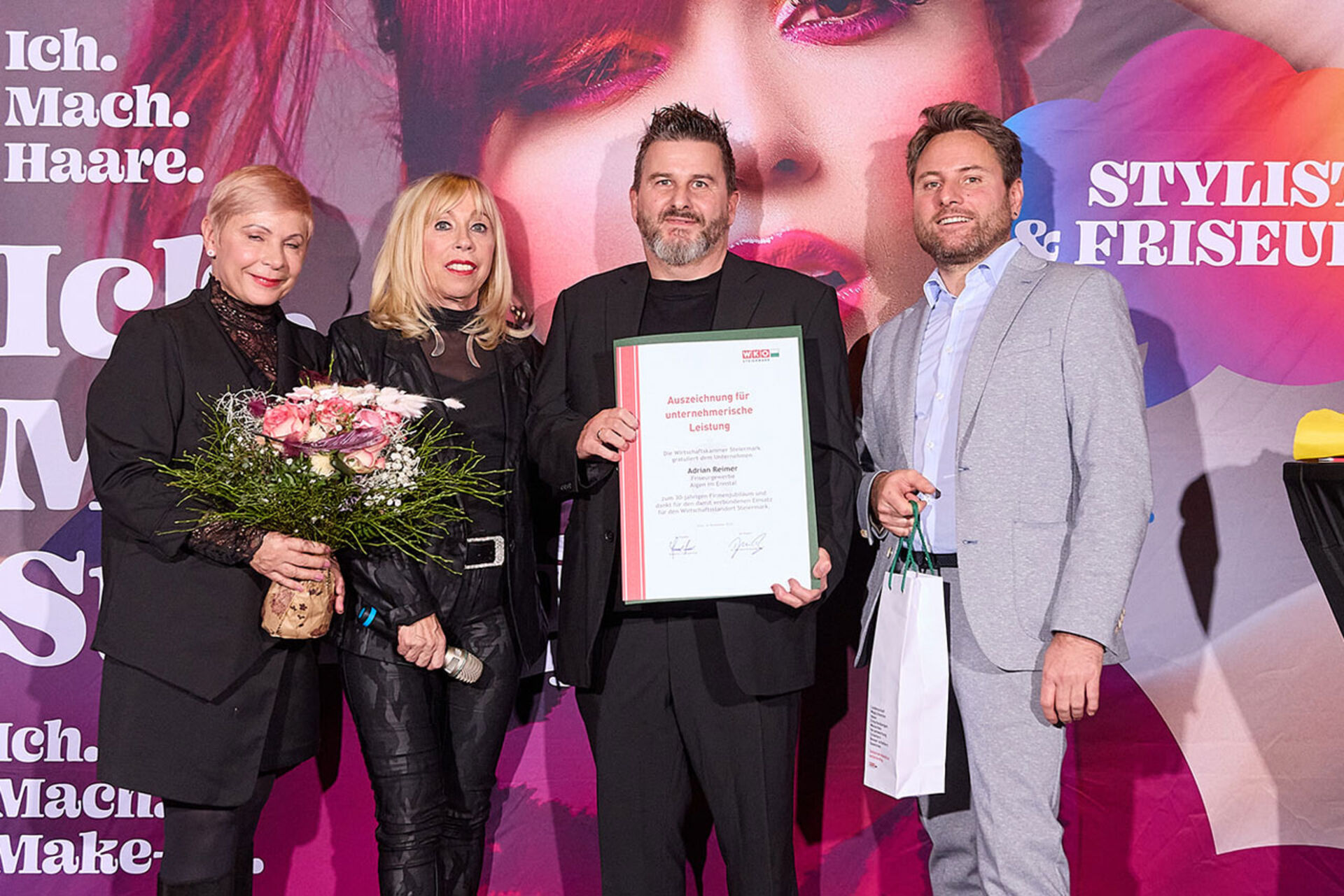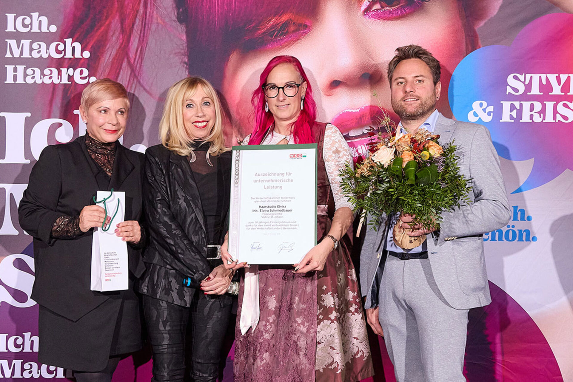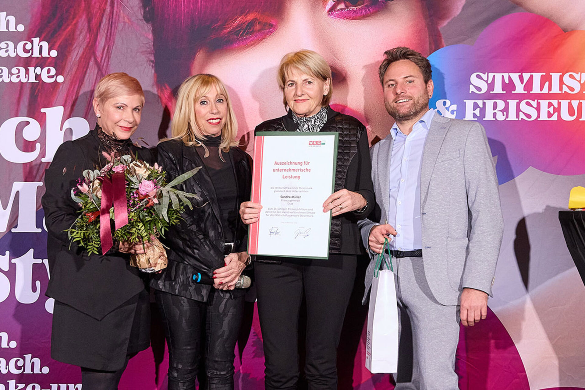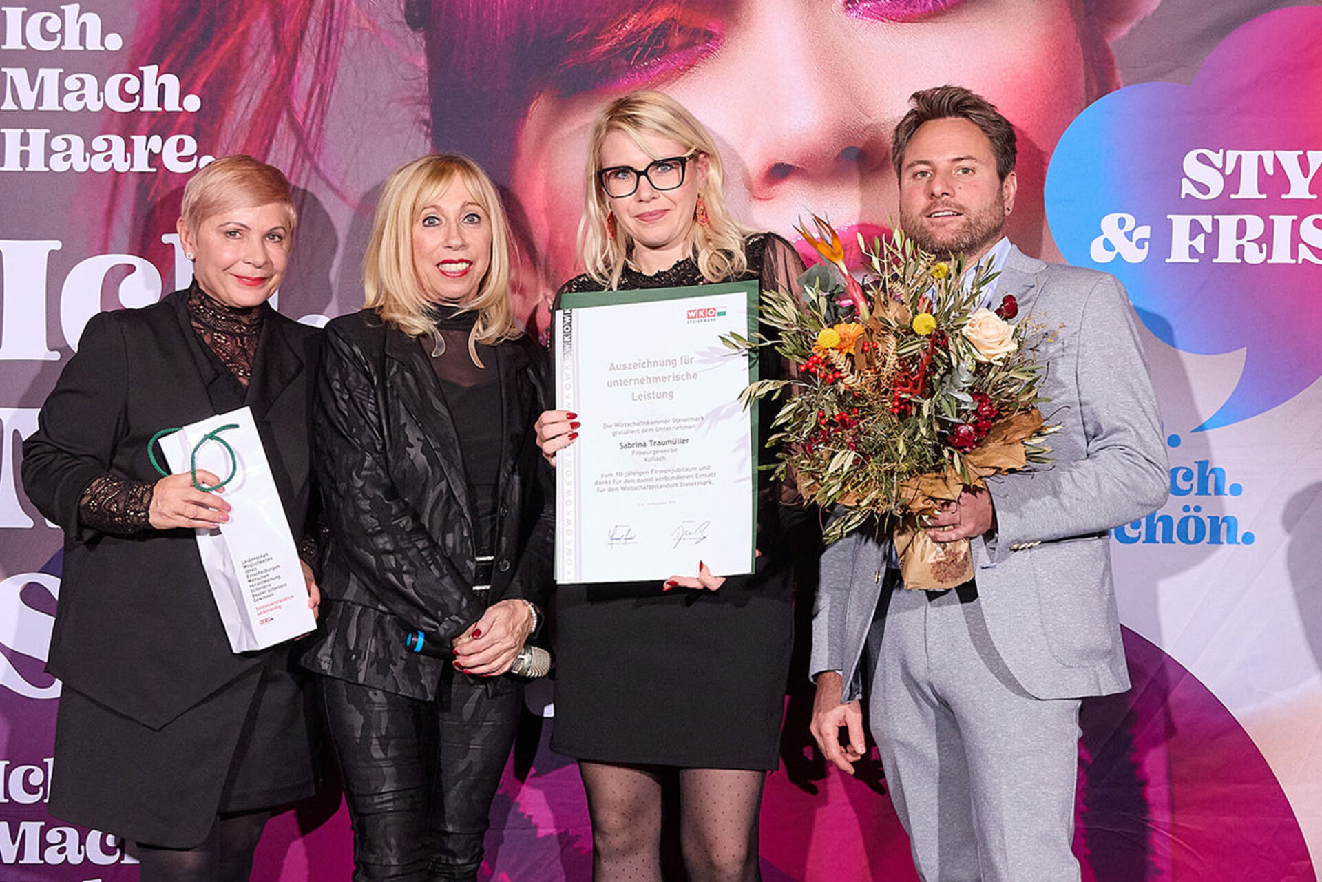 Beim ausgiebigen Dinner, guten Getränken und spürbar gelöster Stimmung wurde geplaudert, genetzwerkt und gemeinsam auf das angestoßen, was so oft im Alltag untergeht: Beständigkeit. Von 10 Jahren bis hin zu beeindruckenden 145 Jahren Unternehmensgeschichte reichte die Bühne – und damit auch die Gänsehaut-Momente. Auffällig (und irgendwie passend): Die steirische Friseur-Unternehmenskultur zeigte sich an diesem Abend klar weiblich geprägt – mit überwiegend Unternehmerinnen, die ihre Urkunden entgegennahmen.