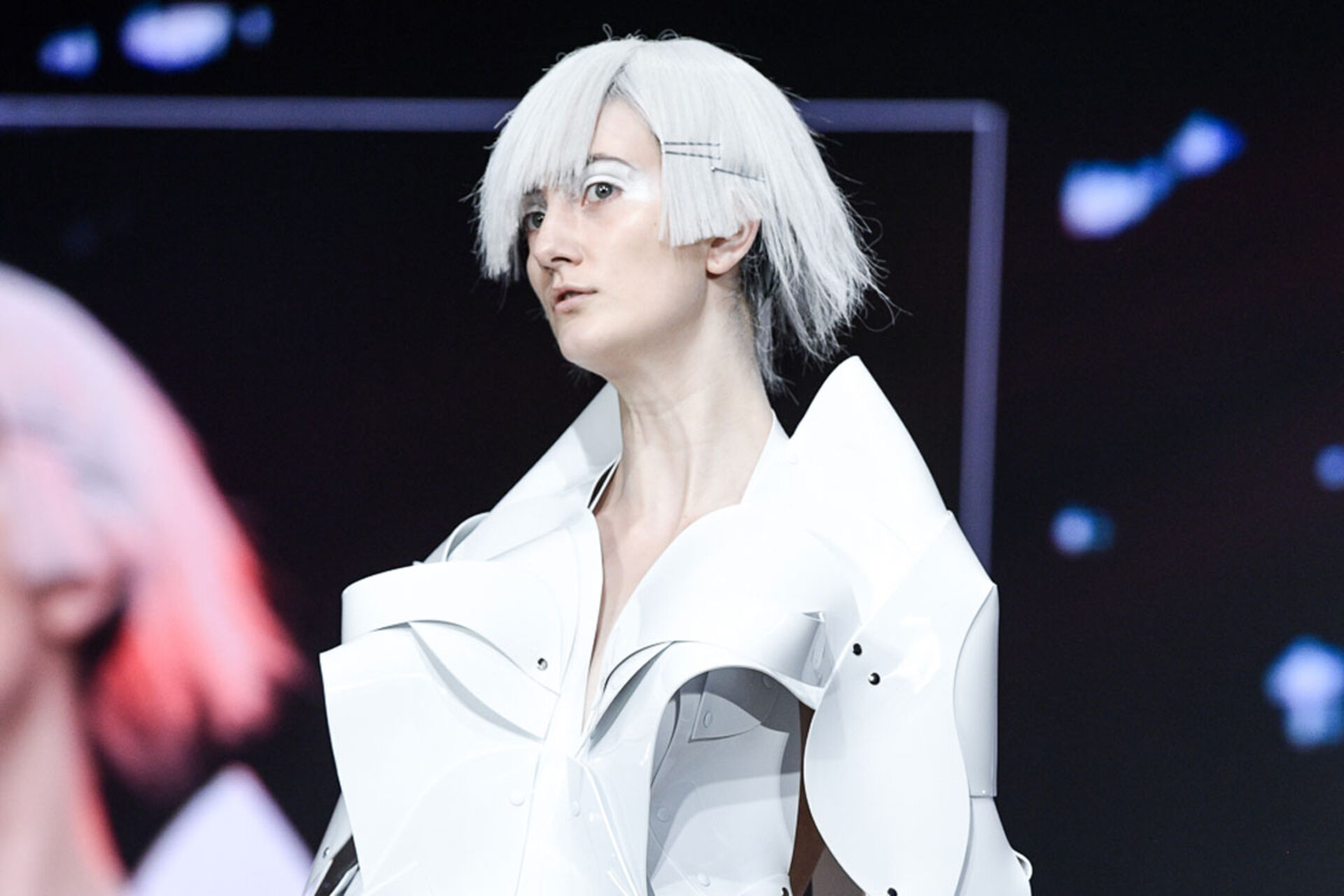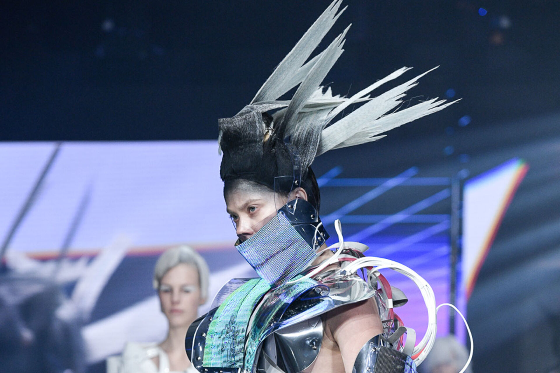 Roboterhafte Schutzanzüge und animierte Screens mit übertriebenen Mimiken als Gesichtsmasken umgehängt verliehen der Show den abstrakten, avantgardesquen Charakter, der zum nachdenken anregte und das Zeitalter von TIGI fuse, der neuen Online Digital Plattform von Tigi einläutet.