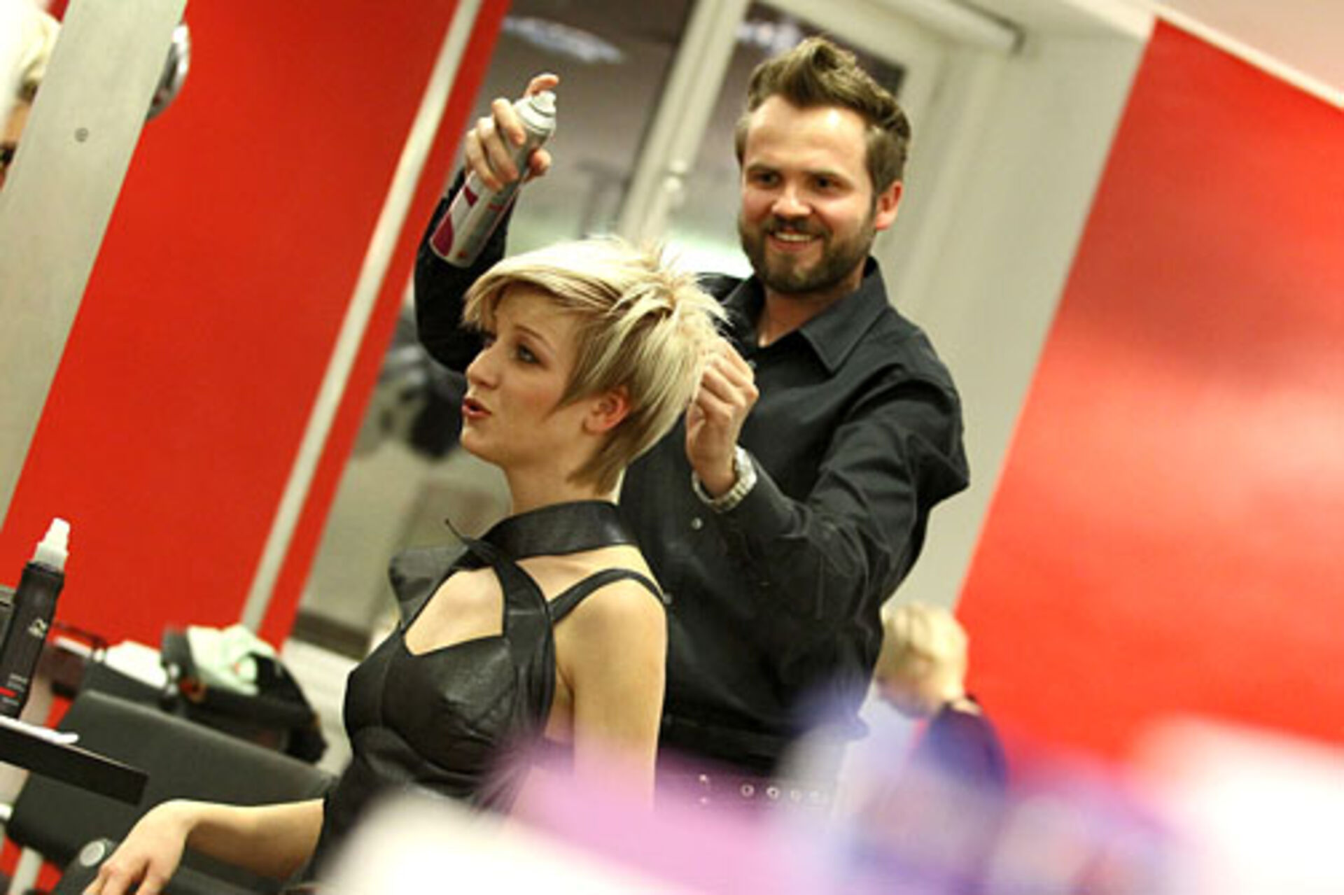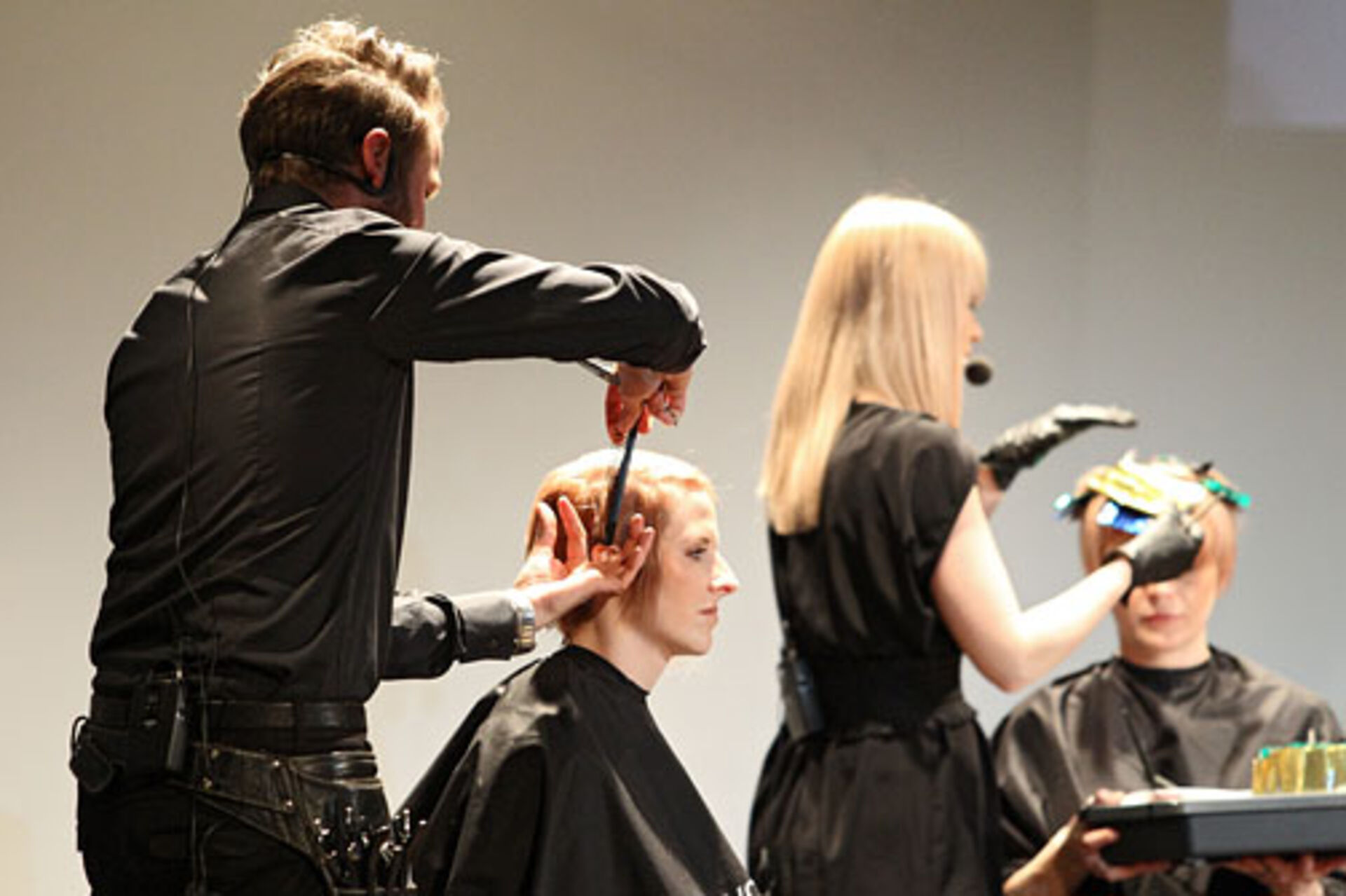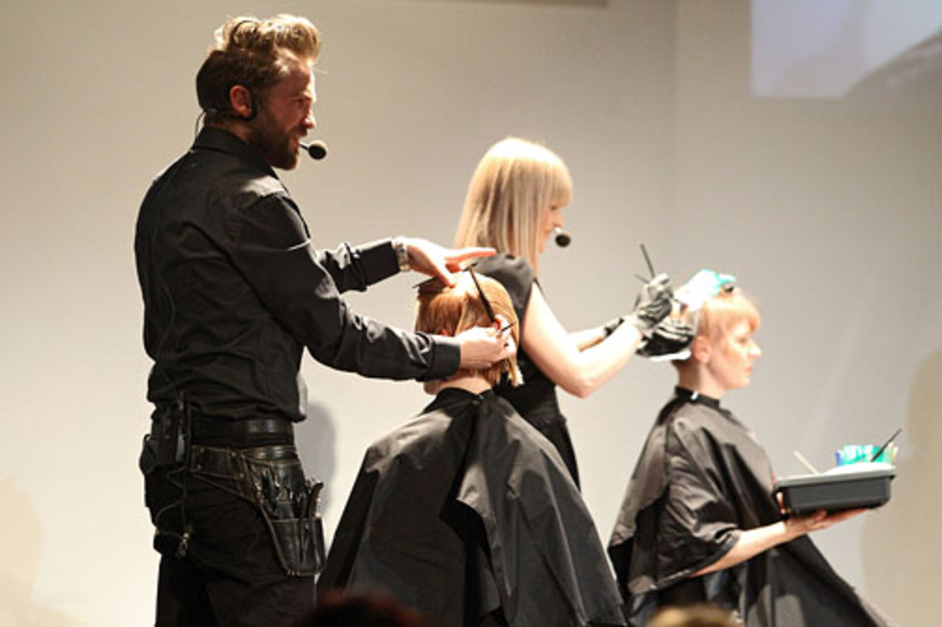 Jens Hagenmüller, Pivot Point Creative Director Deutschland, und Sabrina Holtz, Pivot Point Master Instructor, zeigen im Studio Wien ihre Interpretationen der Trends "Lumina" und "Passionista" in Schnitt, Farbe und Styling.