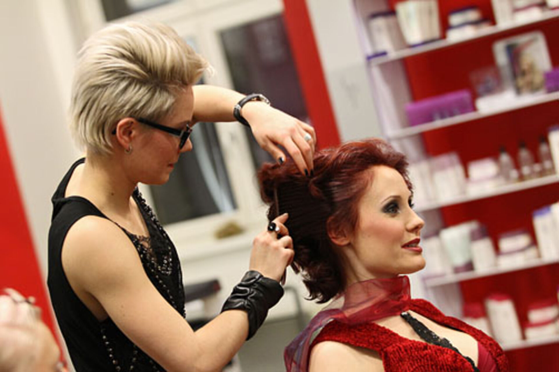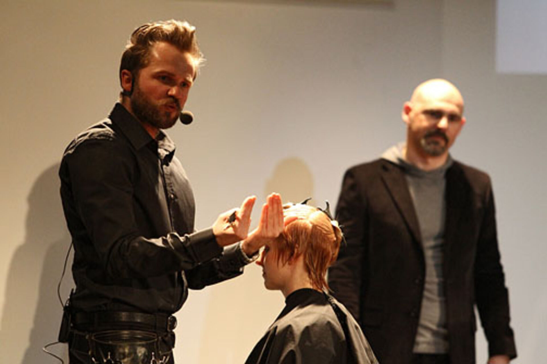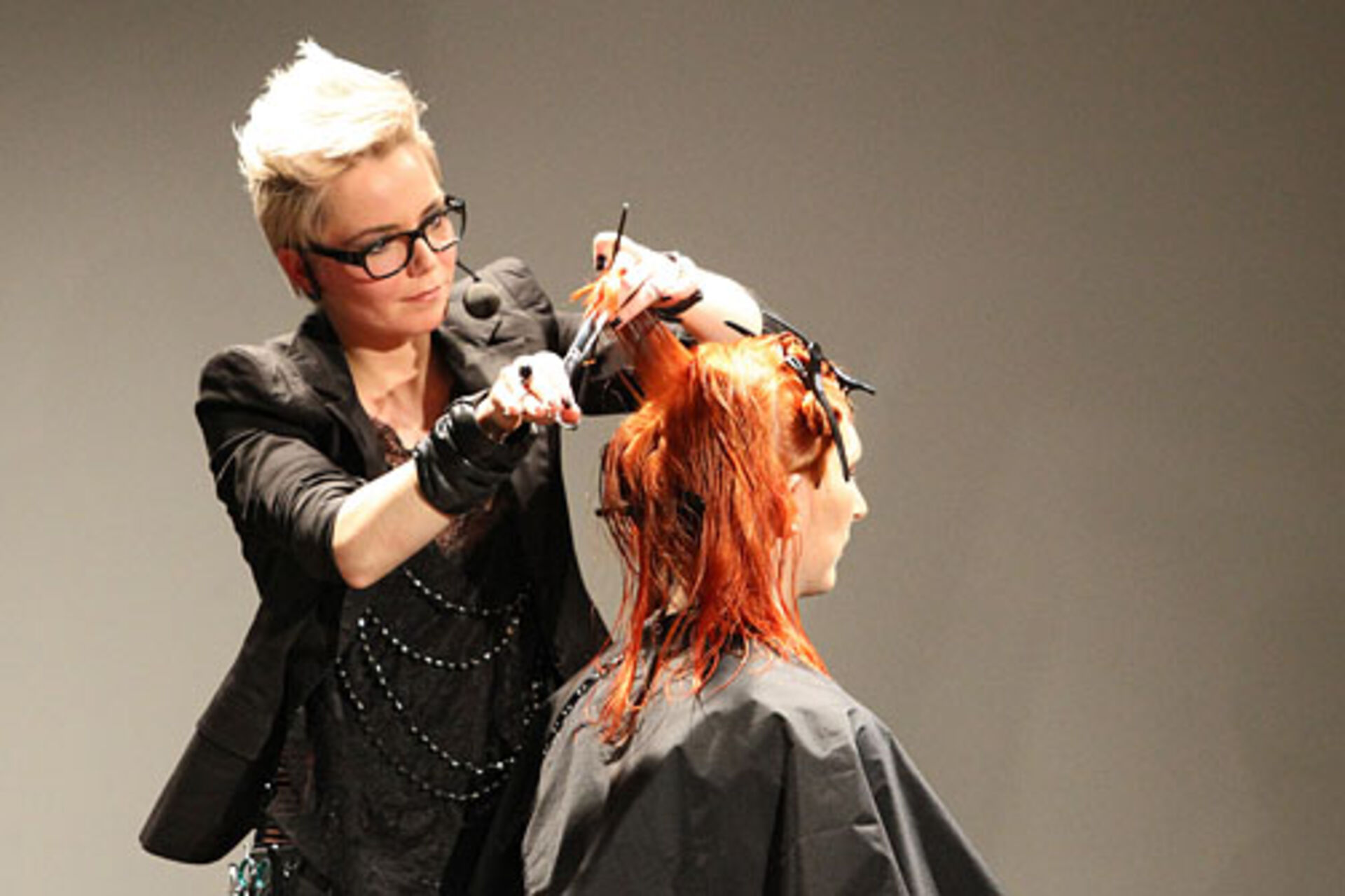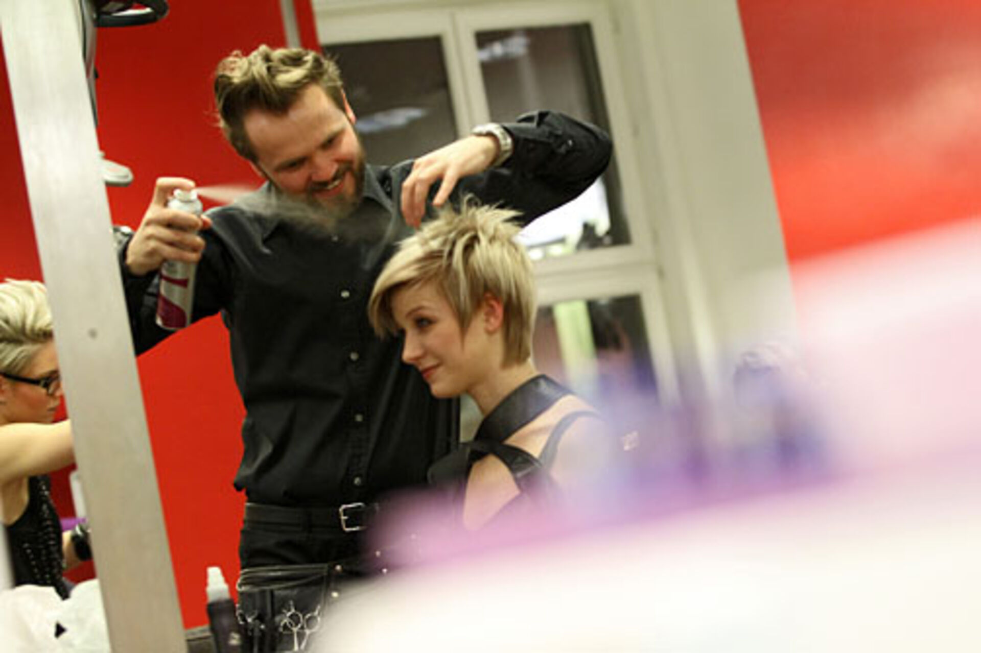 Jens Hagenmüller, Pivot Point Creative Director Deutschland, und Sabrina Holtz, Pivot Point Master Instructor, zeigen im Studio Wien ihre Interpretationen der Trends "Lumina" und "Passionista" in Schnitt, Farbe und Styling.