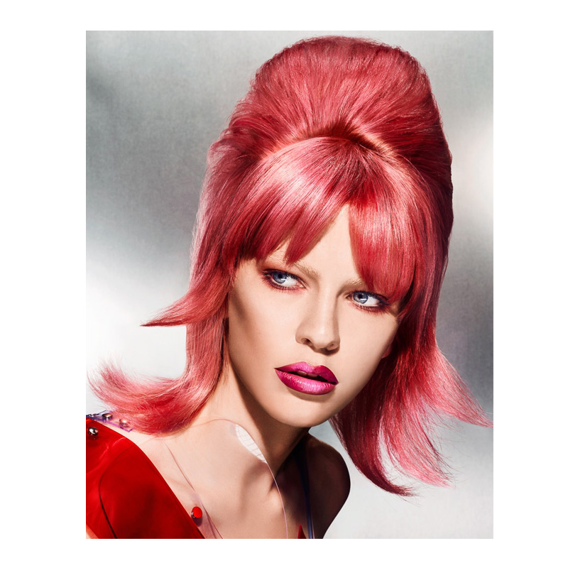 Die gesamte Kollektion ist futuristisch. Das pinke Bild, sowie das gesamte Konzept, ist von den Sechzigern und ihrer Interpretation, wie die Zukunft aussehen wird, inspiriert. Die größte Inspiration bekomme ich von Filmen, wie etwa Star Trek mit William Shatner aus 1960. Das heißt, was das Styling und die Haarfarbe betreffen, wollte ich genau diese Star Trek Stimmung: Die Frauen, die immer sehr sexy waren – sowohl in den Sechzigern als auch in den Siebzigern wie z.B. Jane Fonda in Barbarella. Auch die Farbtöne der Planeten faszinieren mich: Ich wollte ein starkes Pink kreieren, mit einer Helligkeit, die dem Solarsystem ähnelt.