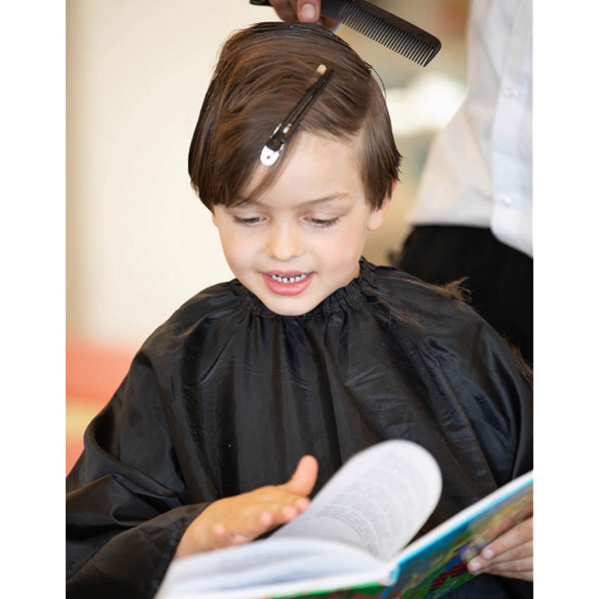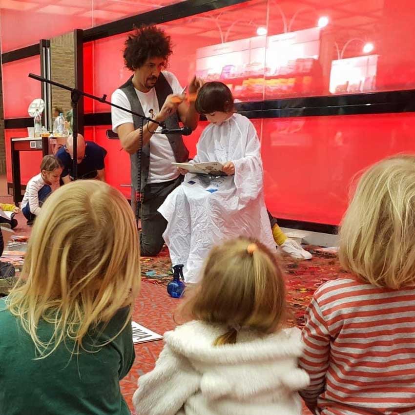 Danny Beuerbach lässt sich während des Haareschneidens von Kindern vorlesen und fördert damit ihre Lesekompetenz! | © zVg v. Danny Beuerbach