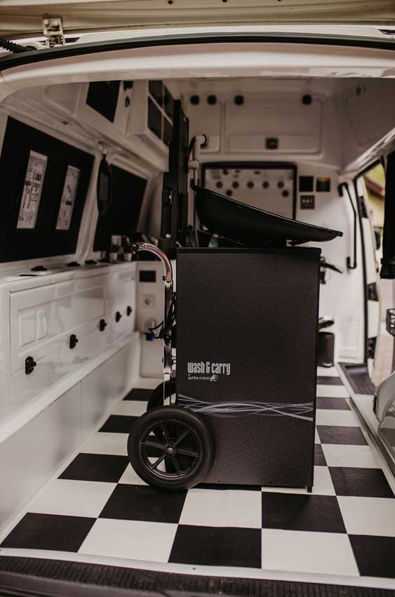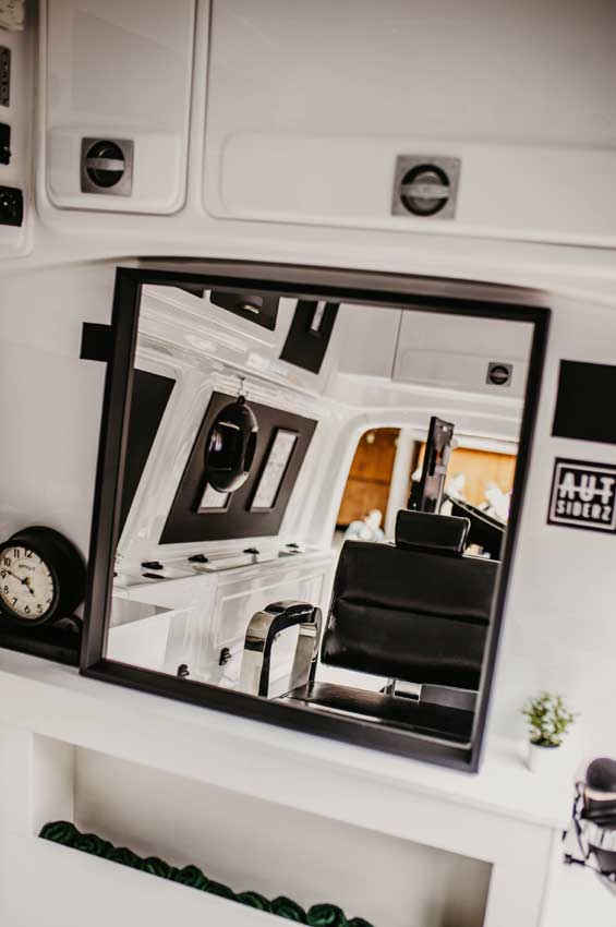 Der vormalige Krankentransporter, der gemeinsam mit fleißigen Helfern umgebaut wurde, ist ein perfekter kleiner Salon, mit einem Frisierstuhl, einem Waschbecken mit Wassertank, Ladestationen, Ablagen und Fächern etc.